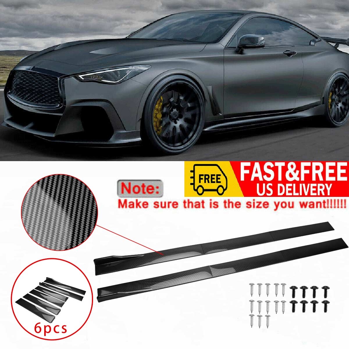 Package Included: 6pcs 2m Side Skirt Extensions (L&R) Please Note: Don't fit for Benz S550 2007 Don't fit for Tesla Model 3 2020-2022 Don't fit for Tesla Model Y 2023 Don't fit for Ford Focus st-line 2018 plate Don't fit for Infiniti G37 Coupe Don't fit for Nissan Sentra 2017 (The