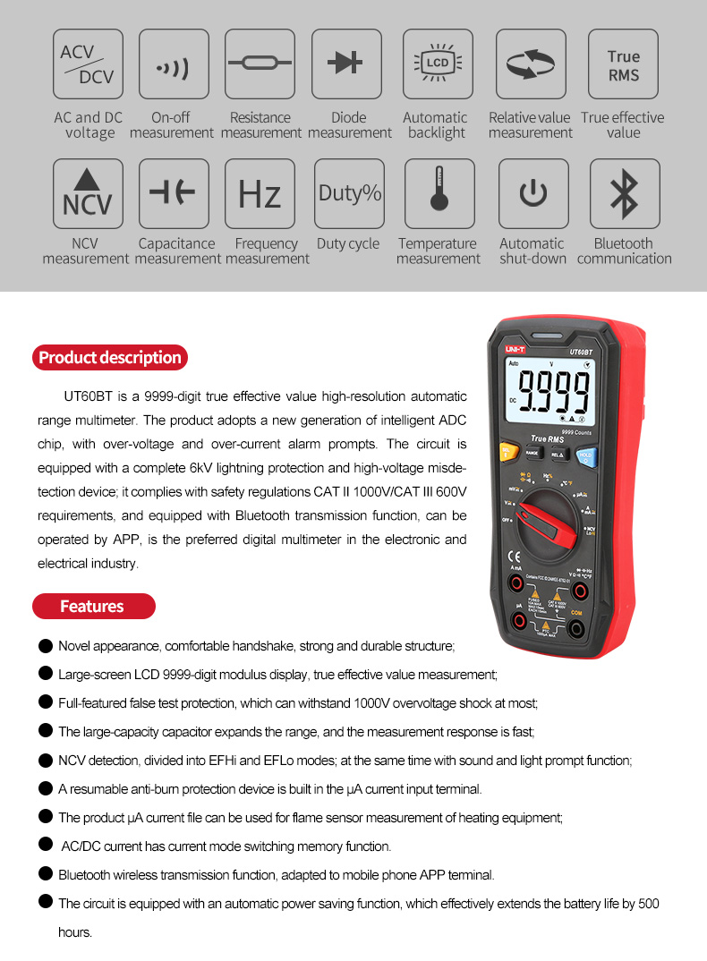 UT60 series digital multimeters provide True-RMS measurement, 9999-count resolution, non-contact voltage detection and many convenient features for users’ testing needs.