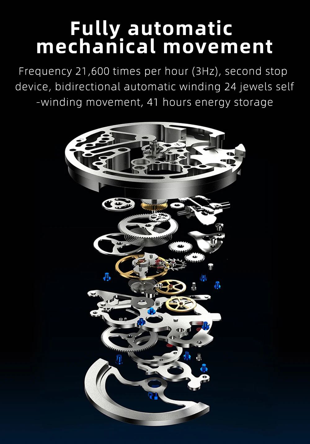Movement features: 3 hands/date, frequency of 21,600 times per hour (3Hz), stop-second device, two-way automatic winding, 24 jewels, 41 hours of energy storage.