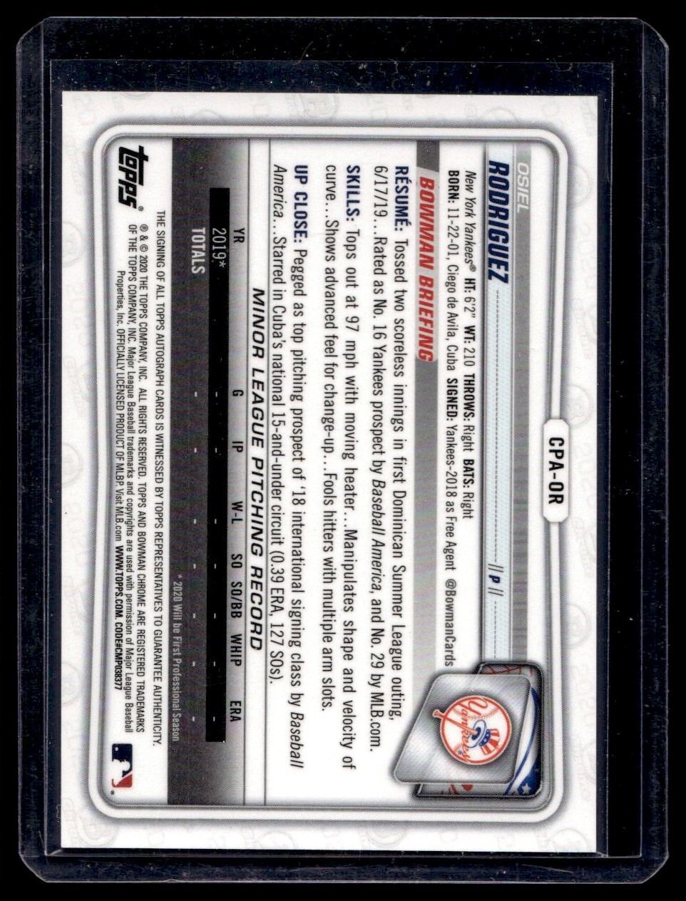 | 2020 Bowman Chrome Prospect Autographs Osiel Rodriguez RC Auto New York Yankees |