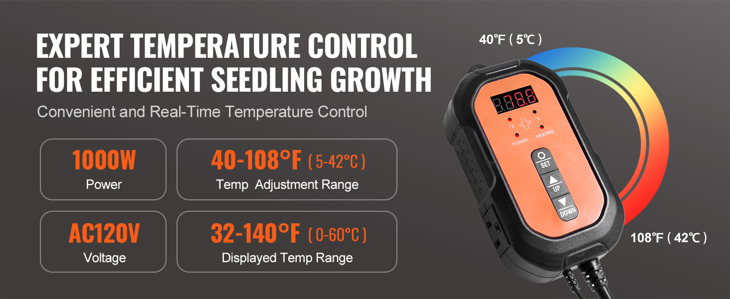 Precision Temperature Control: Expert-level temperature control for more efficient seedling growth. Equipped with temperature monitoring and target setting capabilities, simply place the heating pad beneath your seedling tray, plug in the thermostat, and set your desired temperature. Switch between Fahrenheit and Celsius in seconds to start heating.