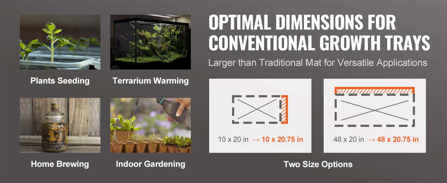 Fits Standard Trays: Fits Standard Trays: Sized for 1020 standard trays, it operates at 17.5W for energy efficiency. Available in two sizes, 1020.75in and 4820.75in, it's versatile for plant germination, indoor gardening, home brewing, and heating glass containers, meeting diverse daily needs.