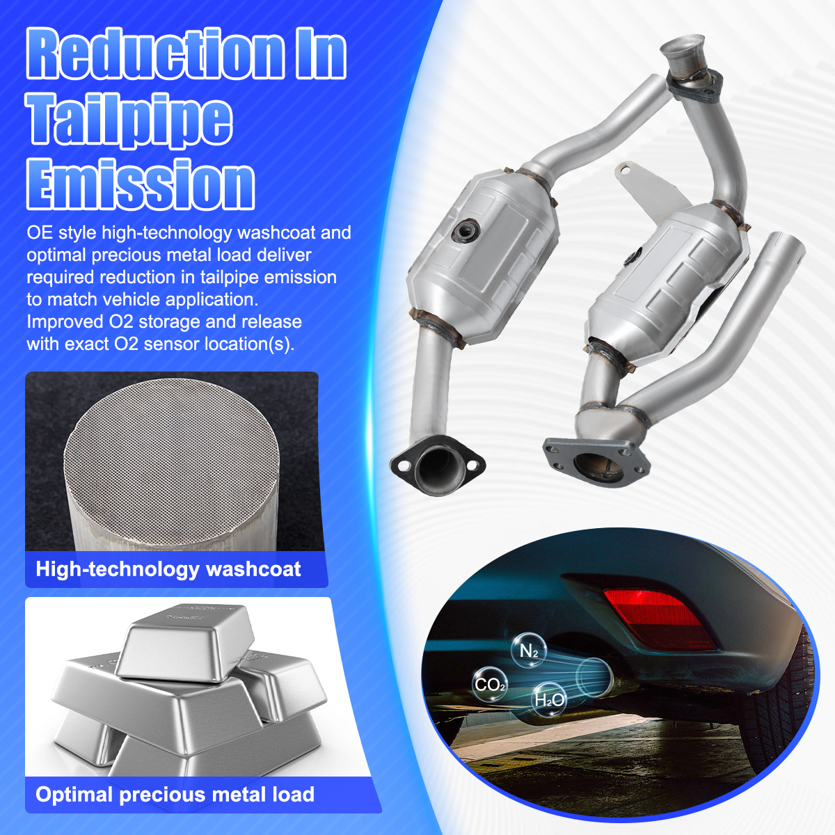 3.OE style high - technology washcoat and optimal precious metal load deliver required reduction in tailpipe emission to match vehicle application. Improved O2 storage and release with exact O2 sensor location(s).