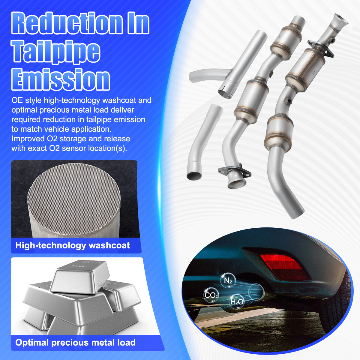 3.OE style high - technology washcoat and optimal precious metal load deliver required reduction in tailpipe emission to match vehicle application. Improved O2 storage and release with exact O2 sensor location(s).