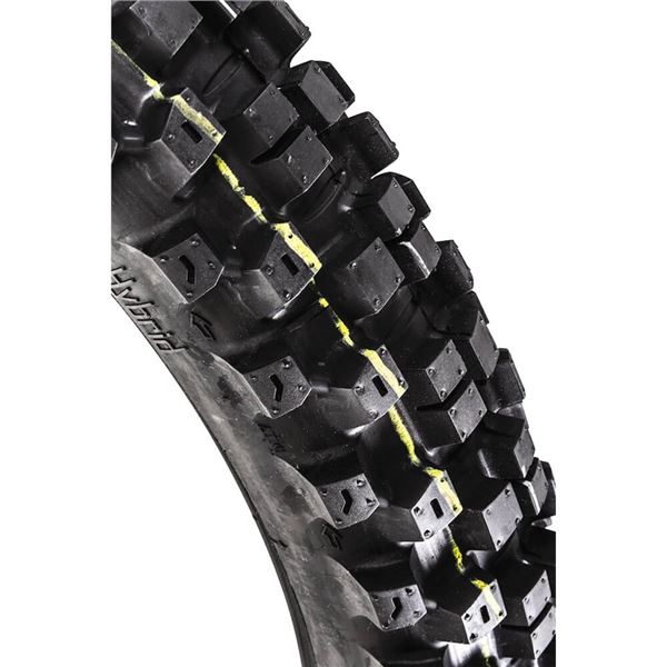 The Motoz Mountain Hybrid dirt bike tire incorporates a new concept in off road tires. By combining the DNA of a trials tire and a serious off road tire this dual sport tire gives trials like grip while maintaining the bike's handling characteristics. This design concept works on a flexible tread concave and lock system to give increased traction while avoiding punctures at low inflation pressures. The Mountain Hybrid climbs like a trials tire, but handles corners, creek crossings, sand and rocks like a regular DOT off road tire. Constructed like a trials tire, but with reinforced sidewalls to allow lower inflation pressure when riding in off road and mountain conditions.