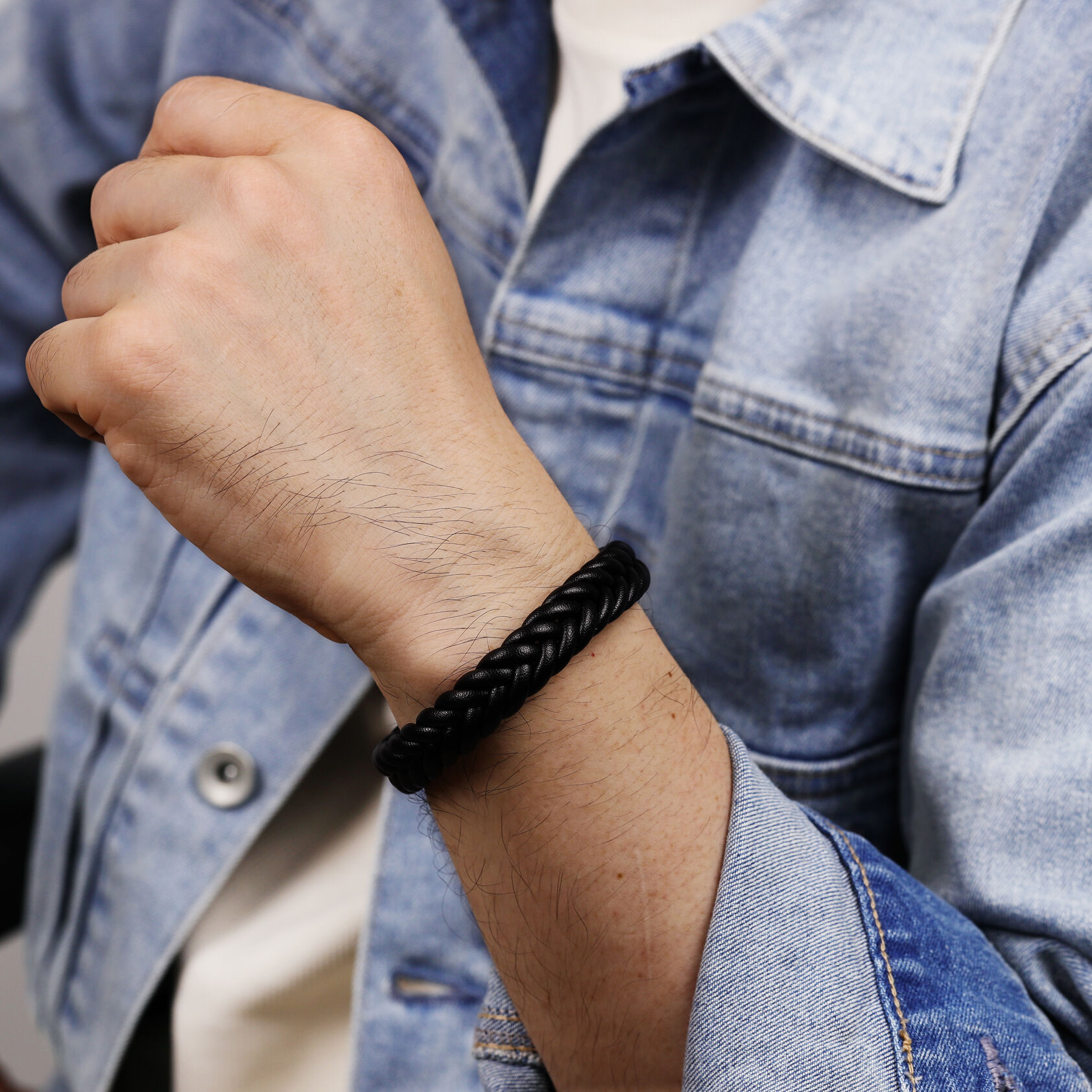 The magnetic clasp ensures a secure fit while adding an extra touch of convenience to your daily routine. Whether you're heading to a business meeting or a casual outing with friends, this bracelet is versatile enough to complement any outfit. The combination of black leather and stainless steel creates a bold statement piece that is sure to turn heads and elevate your style to the next level.