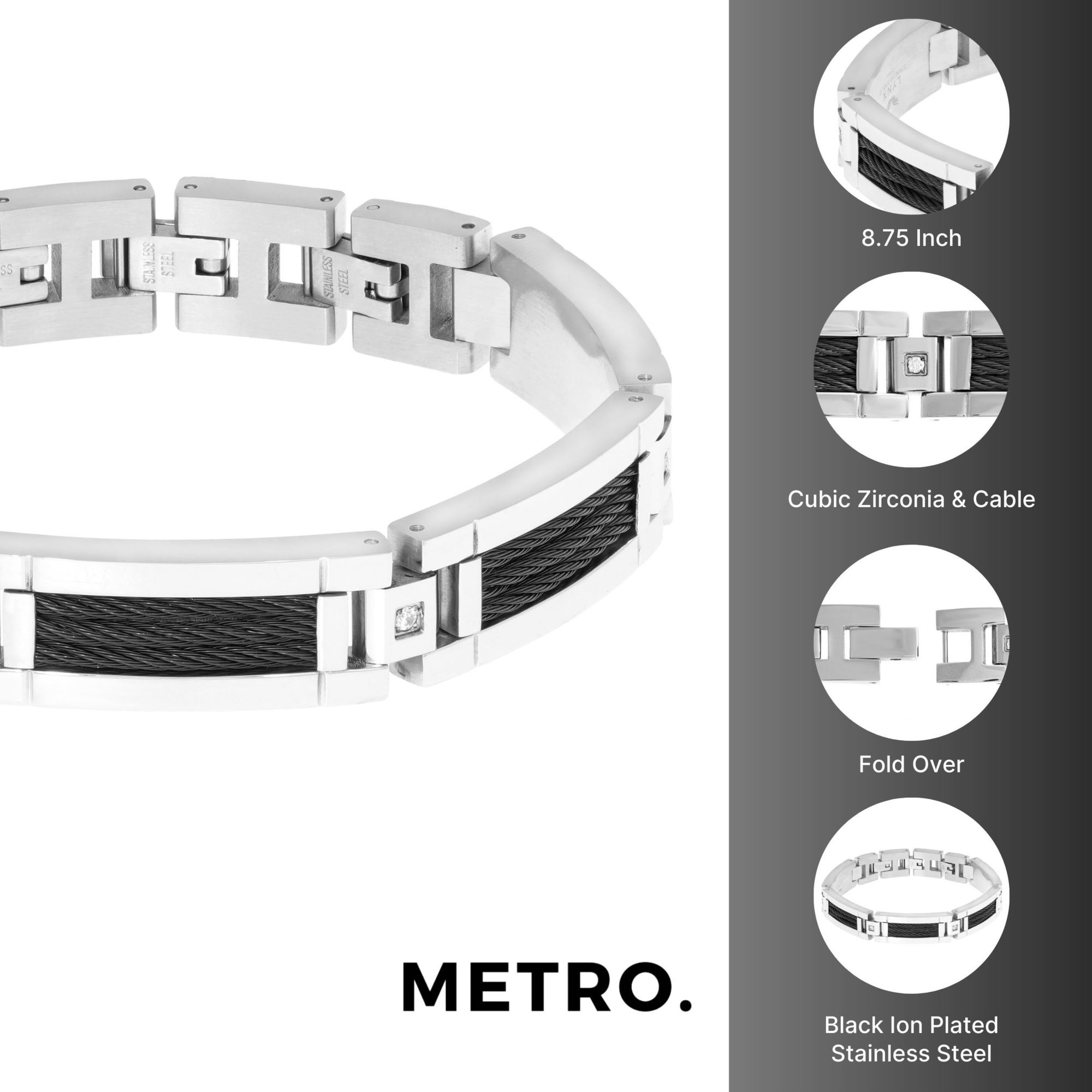 Elevate your style with our Men's Black Ion Plated Stainless Steel Cable Link Bracelet with Cubic Zirconia. Perfect for adding a touch of edgy sophistication to any outfit, this bracelet is a must-have accessory for the modern man. Don't miss out on the opportunity to add this stylish piece to your collection. Order yours today and step up your style game!