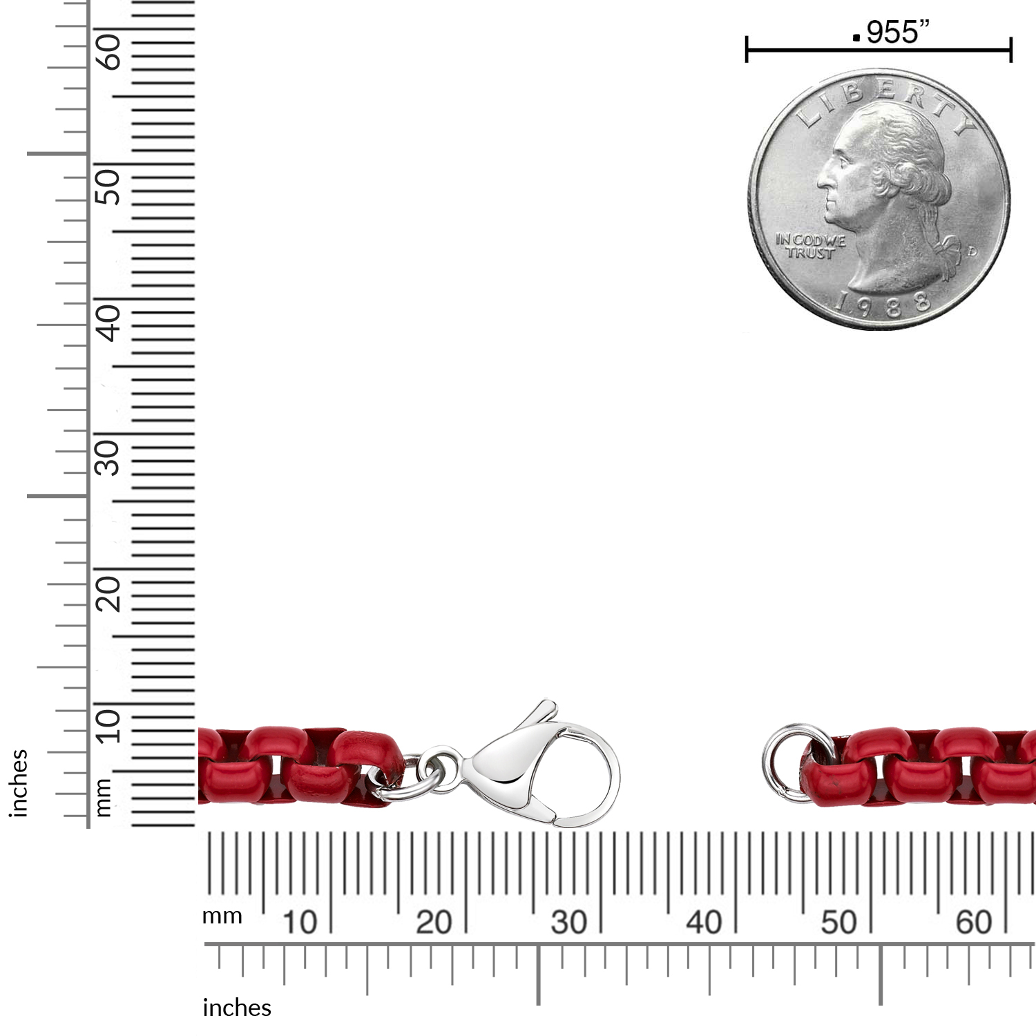 Crafted from durable stainless steel, this 6 MM round box chain necklace features a secure lobster claw clasp, ensuring it stays safely in place all day long. The vibrant red acrylic coating adds a pop of color to your look, making it a versatile piece that can be dressed up for a special occasion or worn casually for everyday flair.