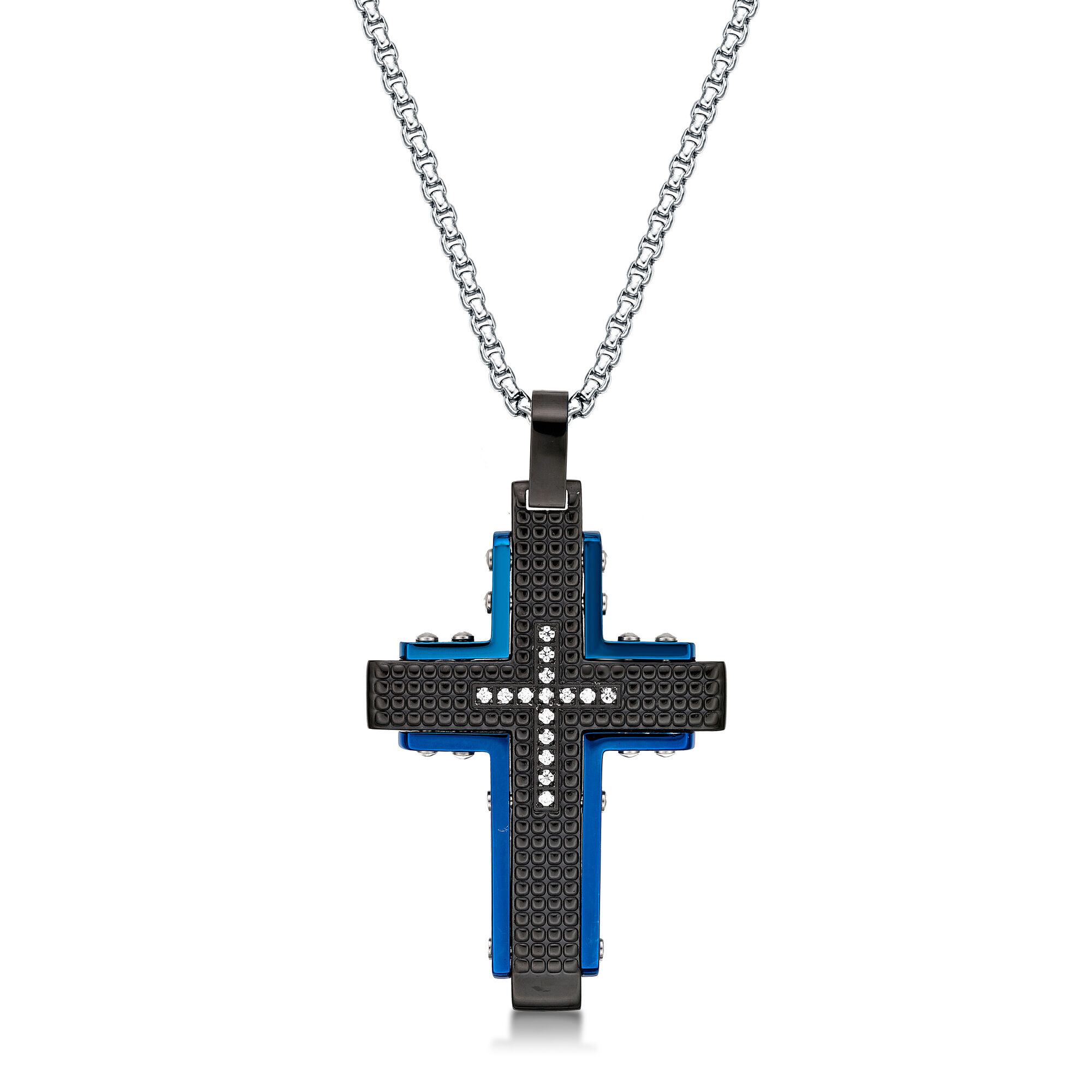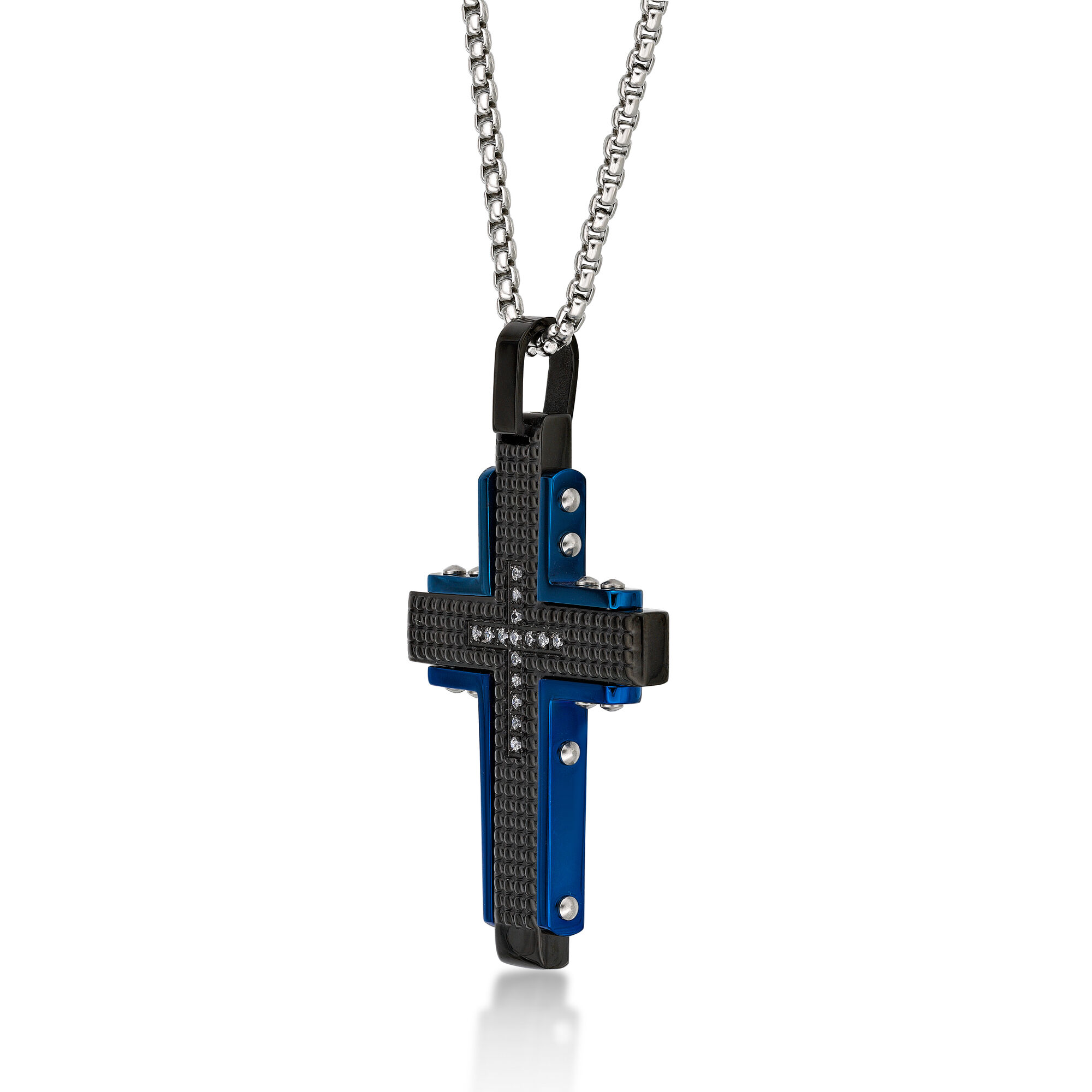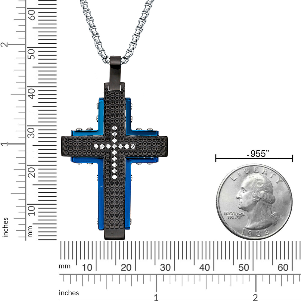 Black and Blue Ion Plated Stainless Steel CZ Cross Pendant - 24" Round Box Chain