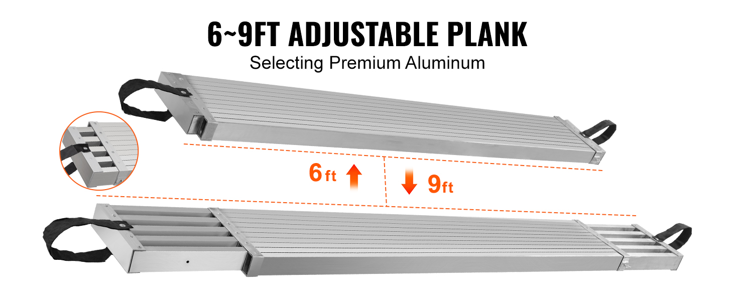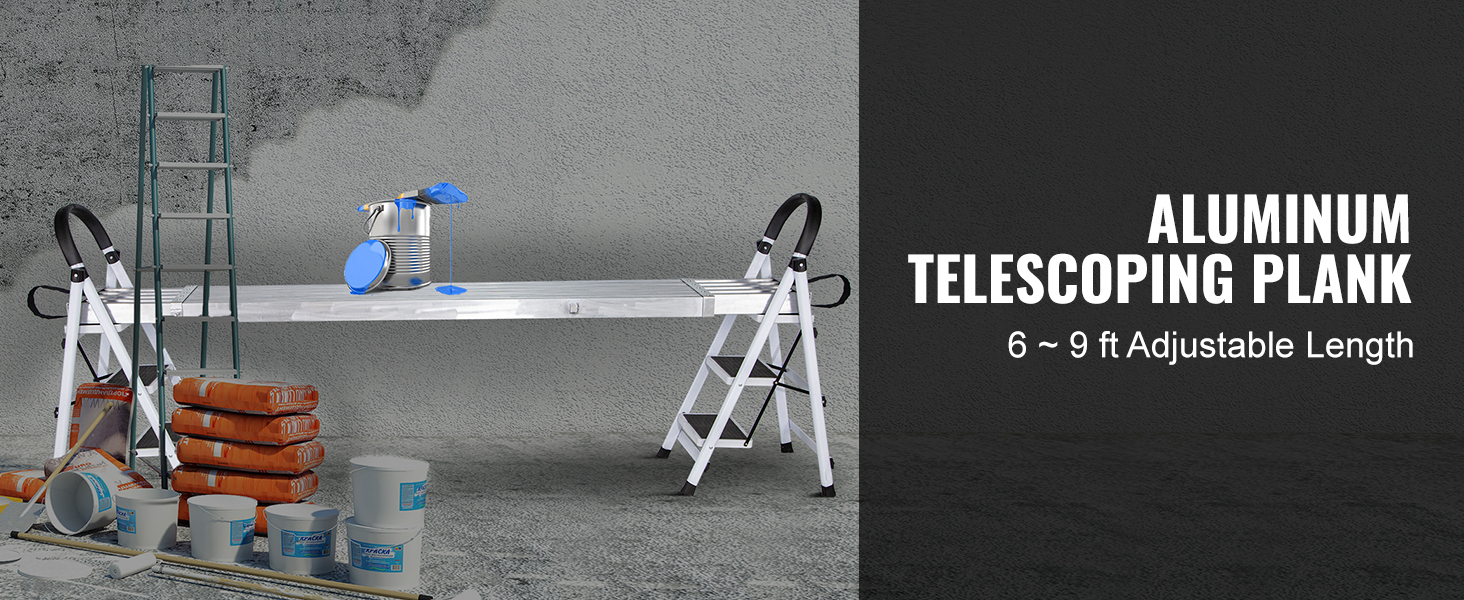 500 lbs Weight Capacity: High-strength aluminum structure can support up to 500 lbs (226.8 kg), accommodating one or two persons standing on the plank for work. This telescoping plank complements scaffolding or ladders for everyday tasks.