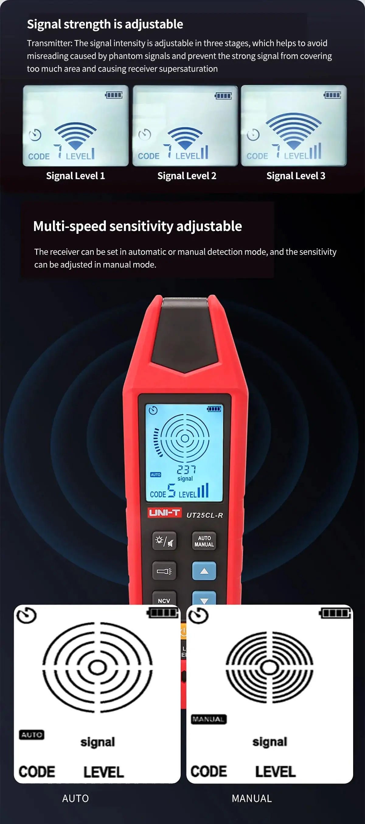 ● Adjust the sensitivity of the receiver automatically or manually (3 adjustable levels)