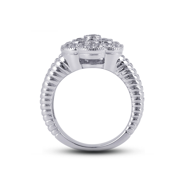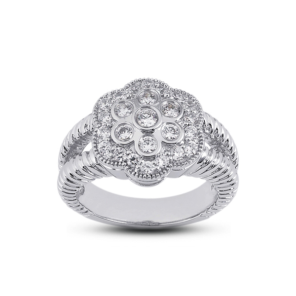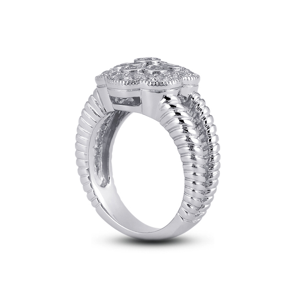 Capture the moment with this 0.69 carat total 14k white gold flower head milgrain right hand ring with round brilliant cut diamonds certified by AGI Gemological Laboratories as Natural Earth Mined Diamonds with F color, VS2 clarity, and with Very Good cut and proportions. To accentuate the glow of the stone on this unique jewel our jewelry designer chose bezel & pave setting. This item will come with a 3rd party certificate and an estimate appraisal value of $3,100.
