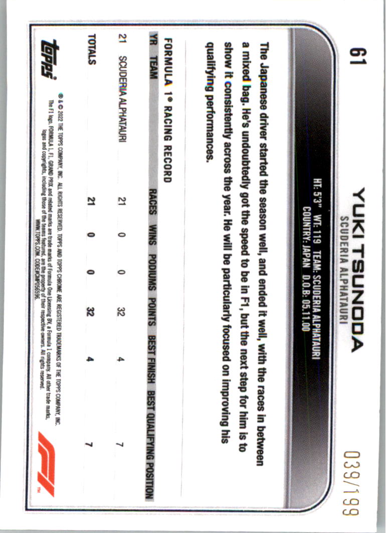 2022 Topps Chrome Formula 1 Purple Checker Flag Ref 61 Yuki Tsunoda199 Racing