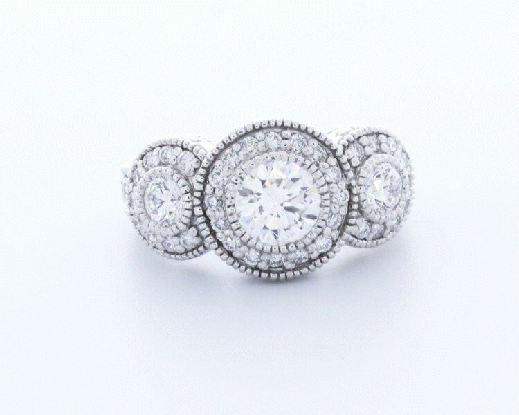 This vintage-inspired three-stone diamond ring exudes timeless elegance. The antique milgrain detailing and hand engraving add a touch of old-world charm, while the bezel and pave setting provide a modern twist. The three brilliant diamonds are showcased in a stunning arrangement, making it a perfect symbol of past, present, and future. With intricate details and classic design, this ring is a true masterpiece that will captivate hearts for generations to come.