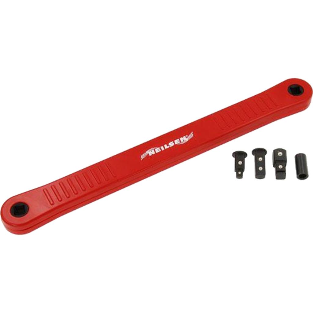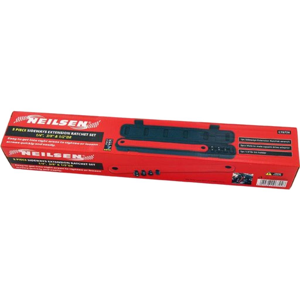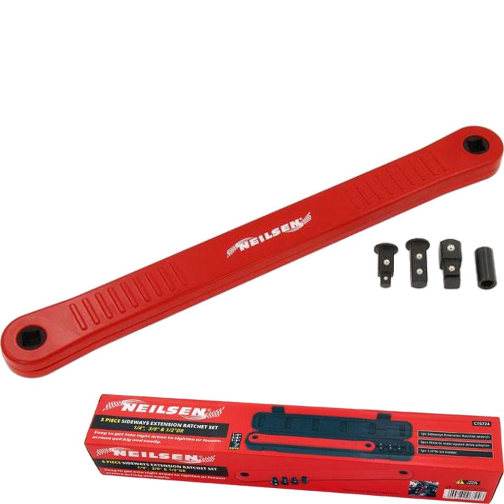 A long sideways extension wrench, easy to get into tight areas to tighten or loosen screws quickly and easily. Comes with 1/2", 1/4", and 3/8" square head adapters, convenient to change the other adapters according to needs. Crafted from robust aluminum alloy ensures durability, safeguarding against bending or breaking during high-intensity jobs. Contents: 1pc Sideways Extension Ratchet wrench, forward & reverse function, total length 340mm. 3pcs Male to male square drive adaptor: 3/8" x 3/8"D, 3/8" x 1/4"D, 3/8" x 1/2"; 1pc 1/4"dr bit holder. Not to be used with air impact tools.
