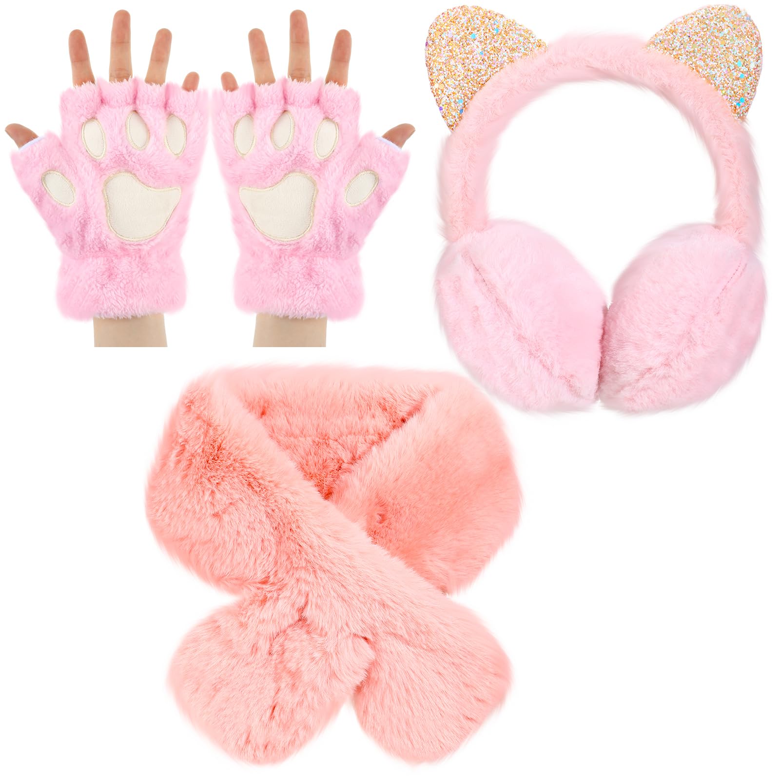 Features: The cat ear muffs, pink paws and furry collar scarf are easy to match with other clothes, such as jackets, coats, dresses, shirts, sweaters and more, to show your stylish and elegant styles. Cat ear earmuffs, pink fingerless gloves and faux fur neck loop can keep your ears, hands, neck and face warm in winter, as well as bring you touch of trend on different occasions, such as weddings, birthdays, Christmas, and others. Specifications: Main material: faux fur Main color: pink Size: as picture shown Package includes: 1 x Cat ear earmuff 1 Pair of pink paws gloves 1 x Furry collar scarf Notes: Manual measurement, please allow slight errors on size. The color may exist a slight difference due to different screen displays.