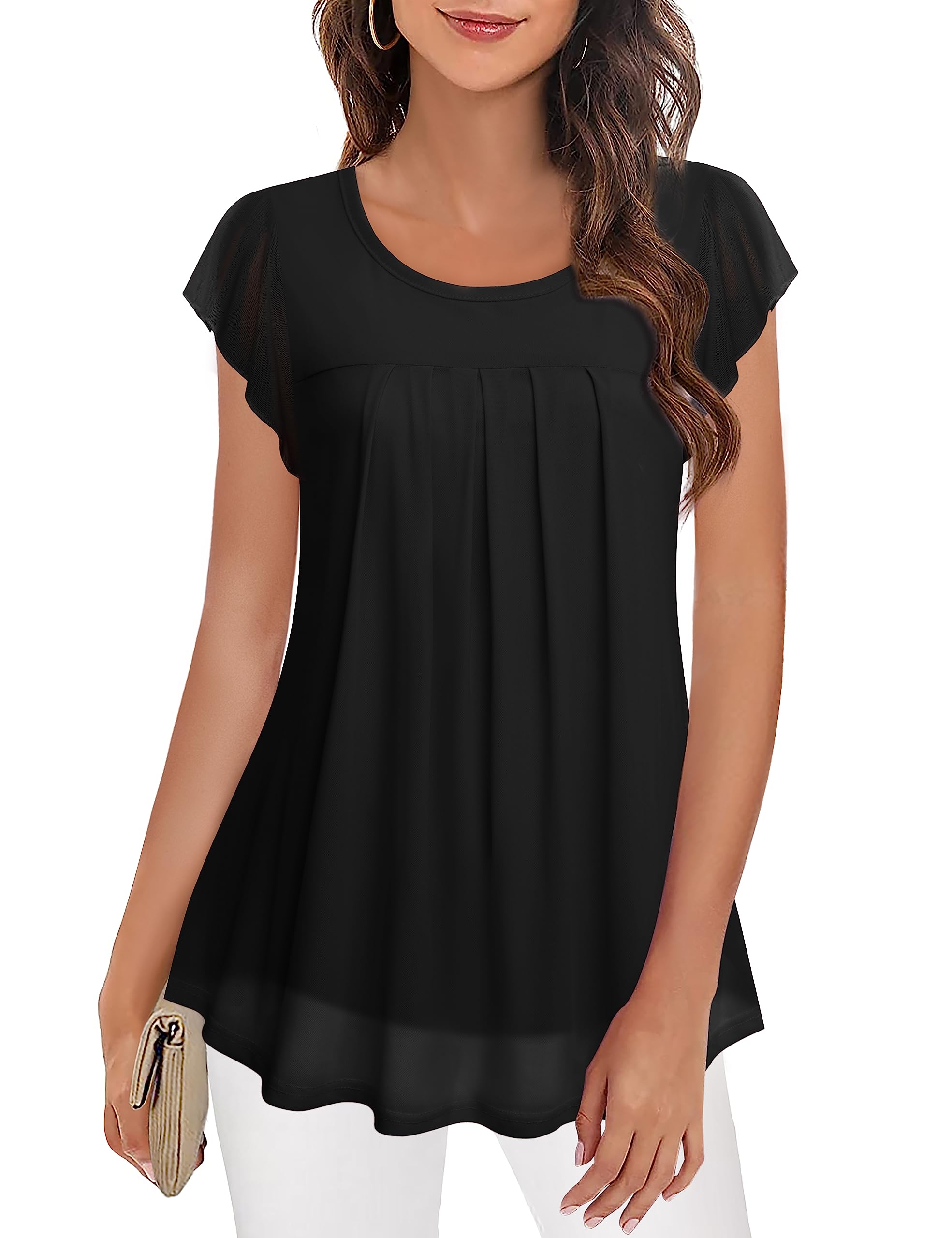 Furnex Women's Short Sleeve Tunics Shirt Floral Pleated Front Mesh Blouses Tops