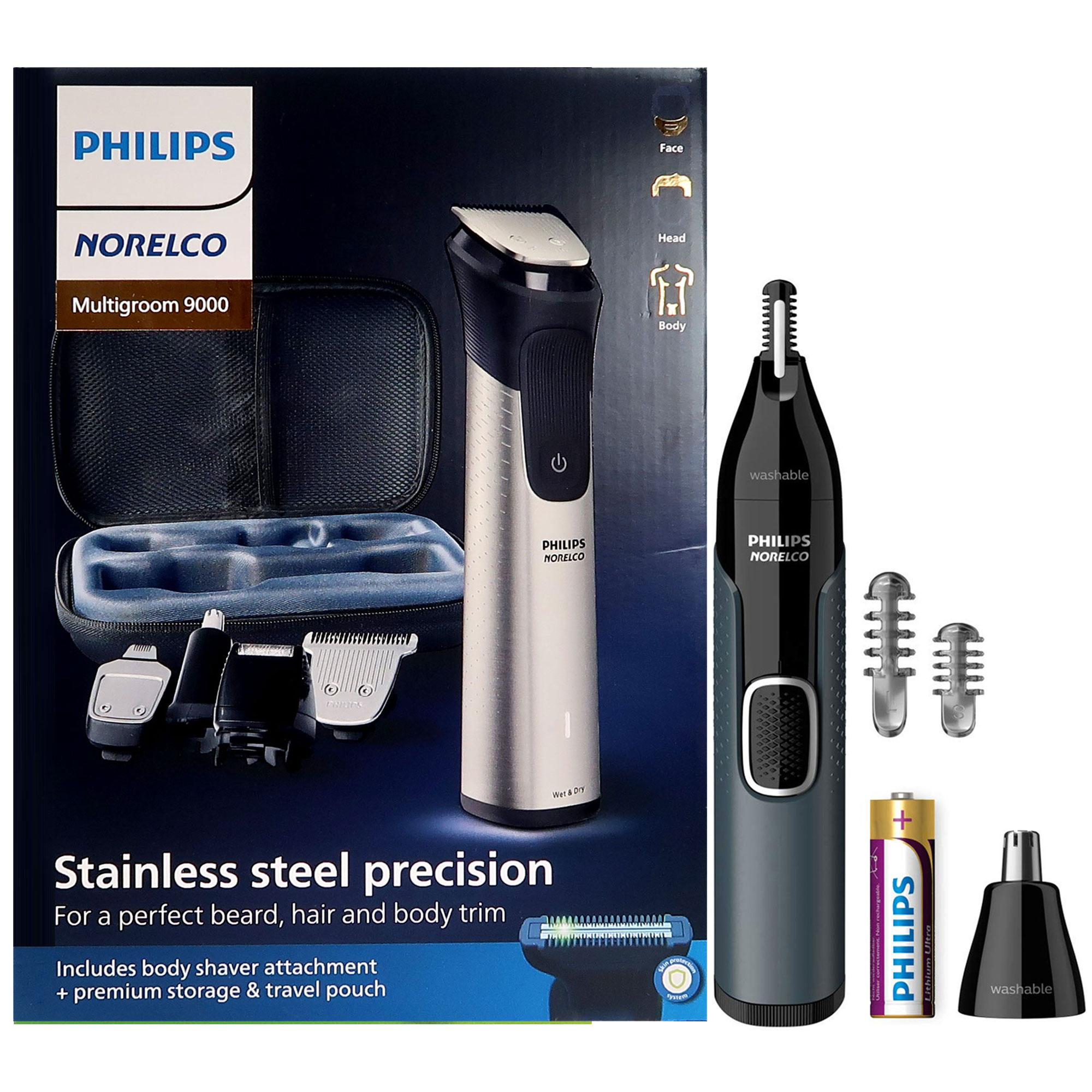 Philips Norelco Multigroom Series 9000 All-In-One Trimmer (Silver) + Philips Norelco Nose Trimmer 3000 for Nose, Ears Eyebrows #NT3600/62 (Black)