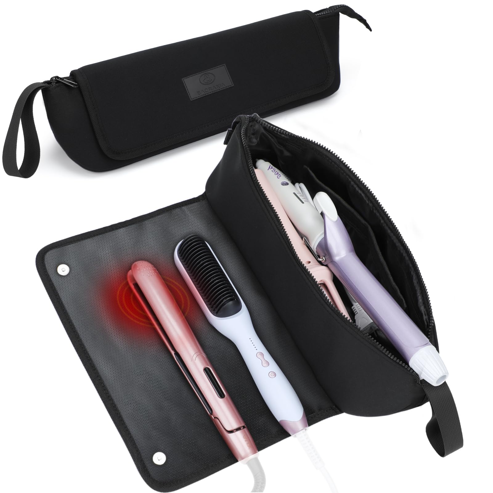 Travel Essentials Neoprene Hair Style Tools Bag w/ Fireproof Mat for Flat or Curling Irons, Straighteners Accessories, Gifts for Women Mom Daughter Sister Friends for Birthday (Black-Fireproof Mat)