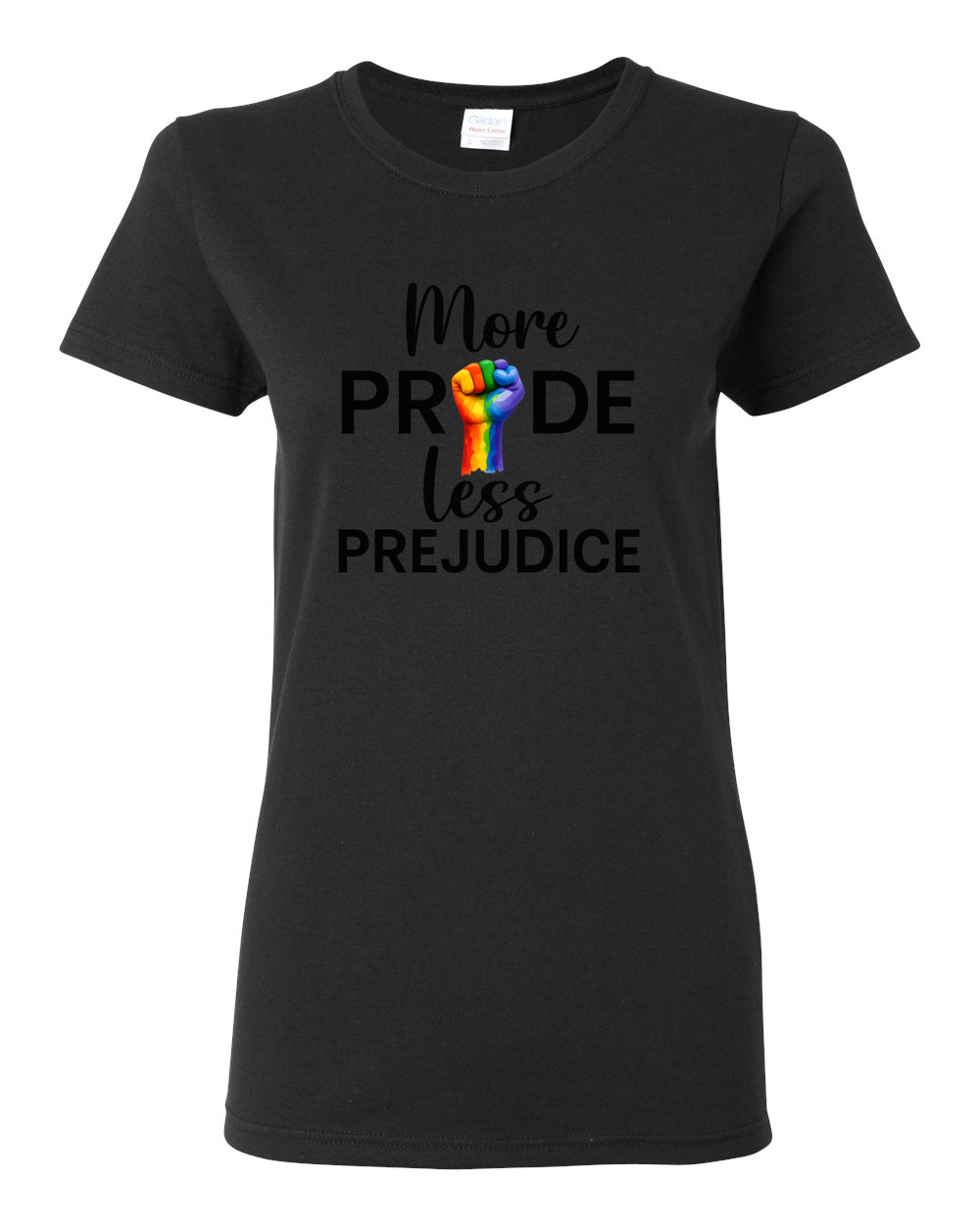 More Pride Less Prejudice Rainbow Fist LGBT Lesbian Gay Bi Trans Pride Month Womens Graphic T-Shirt