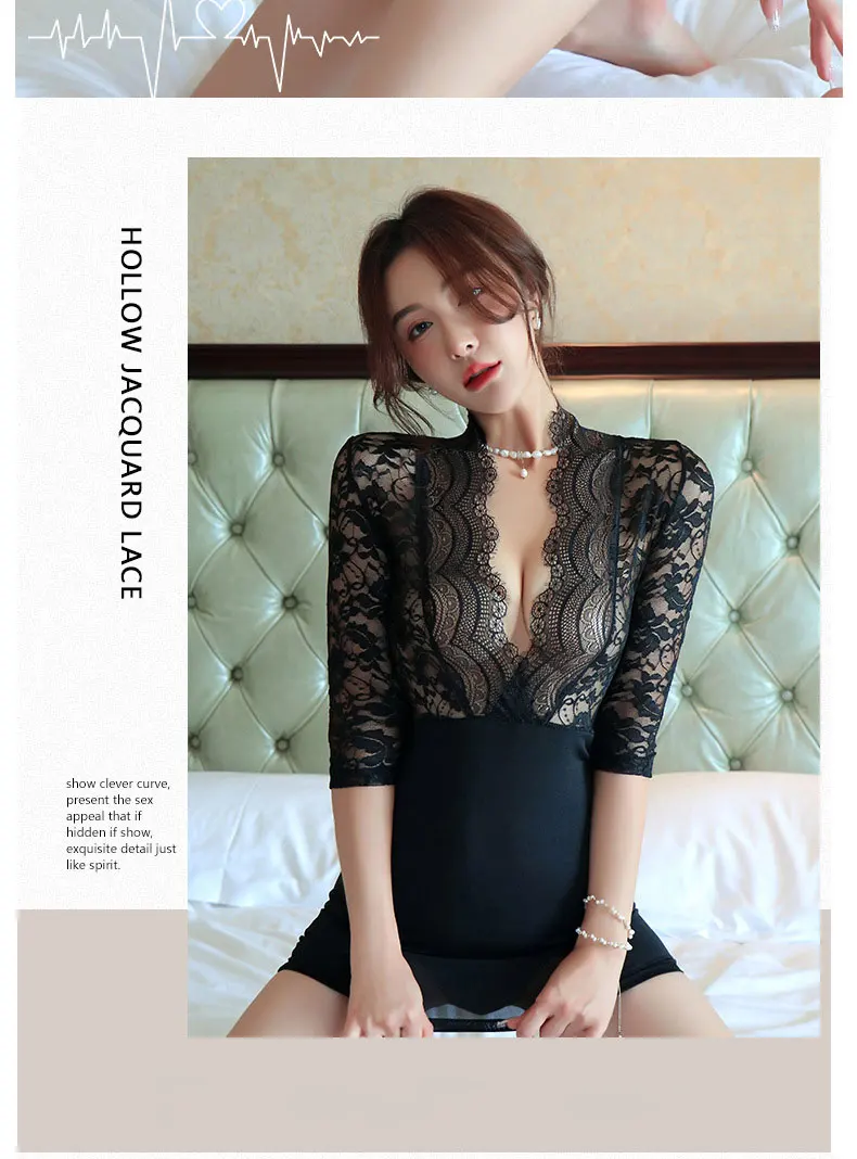 Sexy Lace Patchwork Women's Elegant Bodycon Dresses Deep V Neck Sheer Transparent Female Night Club Pencil Miniskirt Package Hip
