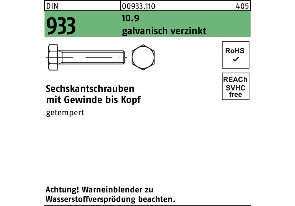 DIN 933 10.9 galvanisch verzinkt Sechskantschrauben mit Gewinde bis Kopf - Abmessung: M 10 x 25 VE=S (200 Stück )Weitere technische Eigenschaften:
