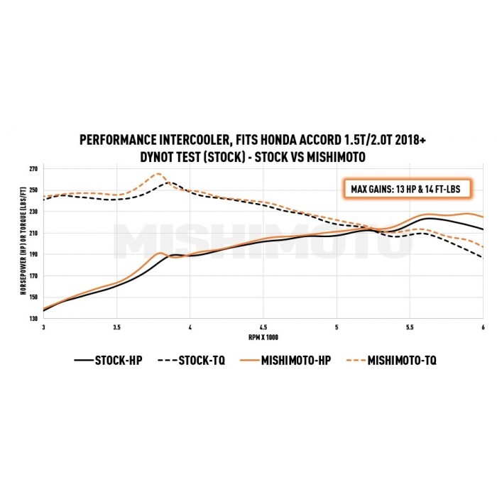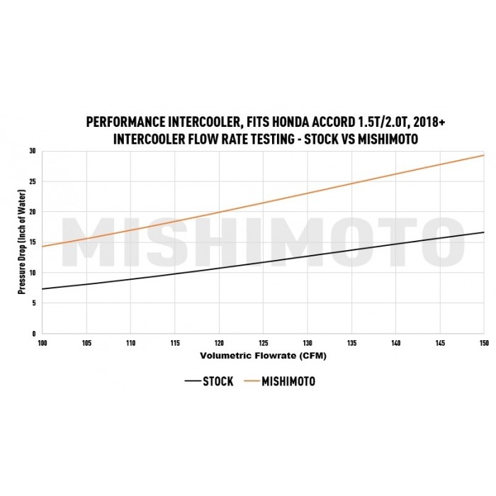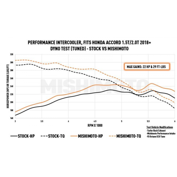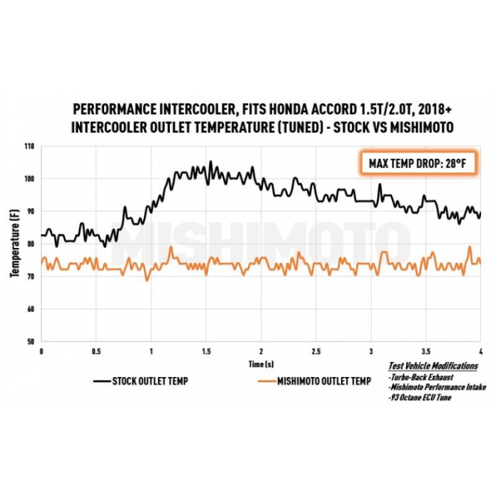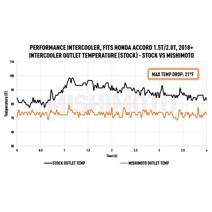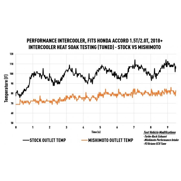 | Tech Specs | Applications: Honda Accord I4 (1.5) 2018-2021--Honda Accord I4 (2.0) 2018-2021 Chassis Codes: CV1--CV2 Core Height (in): 5.9 Core Type: Bar-and-Plate Engine Codes: L15BG--L15BE--LFA1--LFB1 Installation Notes: 27 in-lbs (3NM) recommended for all T-bolt and constant-tension T-bolt clamps. These clamps have an operating range of 18-35 in-lbs (2-4NM). Do not exceed the maximum torque rating of 35 in-lbs (4NM). Maximum Recommended Boost Pressure (PSI): 100 Note: All power and temperature figures were collected from 3rd-gear pulls on our DynaPack Dyno--Our modified power output numbers were tested on a 2.0T equipped test vehicle with the following modifications: --Cat-less Turboback Exhaust--Mishimoto Performance Intake--93 Octane ECU Tune----If your stock cold-side O-ring is damaged and not re-usable, we recommend replacement with Honda P/N 19716-6A0-A01 |