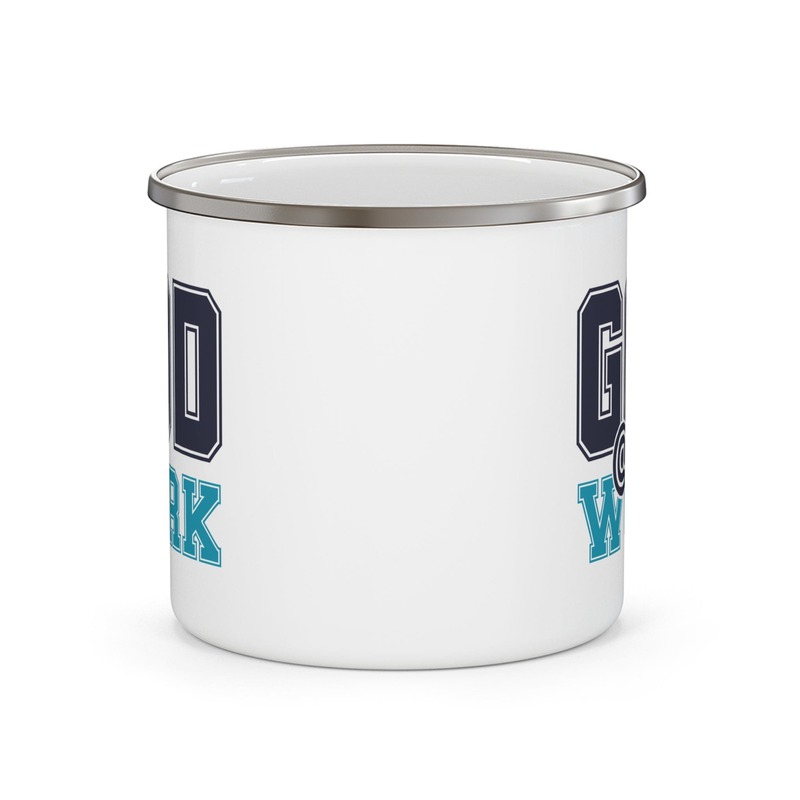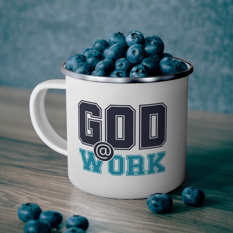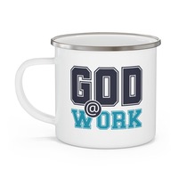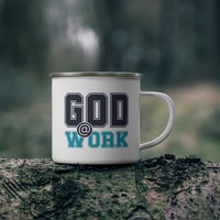 Enamel Camping Mug - God @ Work Navy Blue and Blue Green Print