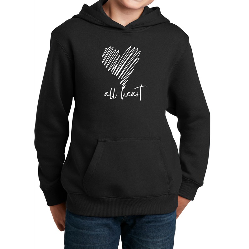 Youth Long Sleeve Hoodie Say It Soul - All Heart Line Art Print. This hooded sweatshirt is meticulously crafted for individuals with a creative spirit. This comfy hoodie is more than just a casual top—it's a manifestation of personal style. Design with a youthful flair, the hoodie seamlessly fits into the wardrobe of creative minds who seek a blend of comfort and modern aesthetics. Whether you're drawn to chic styles, or simply looking for a cool and edgy piece to express your personality, this graphic hoodie effortlessly combines functionality with a distinctive design that resonates with the artistic soul.