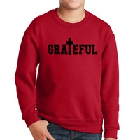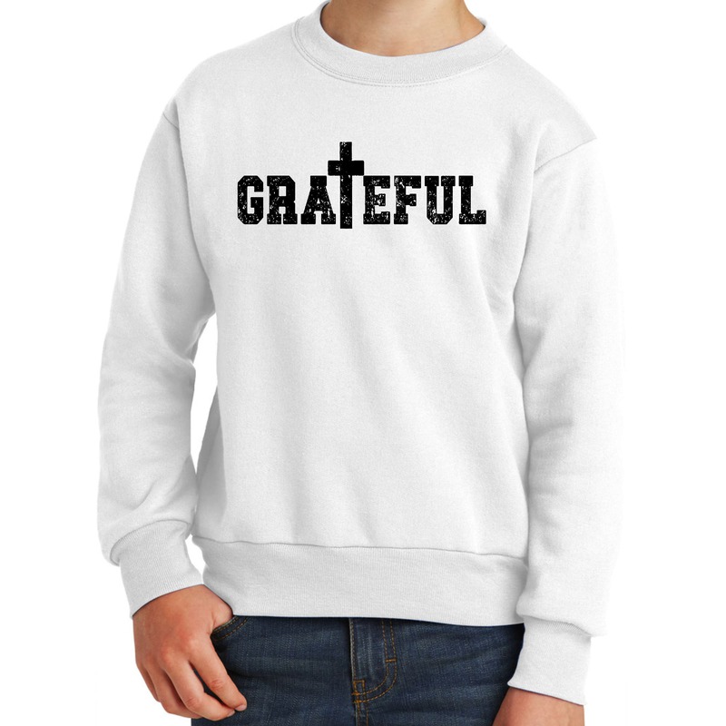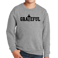Youth Graphic Sweatshirt Grateful Print. This crewneck sweatshirt is durable, made to last, and is comfortable enough to wear all day.