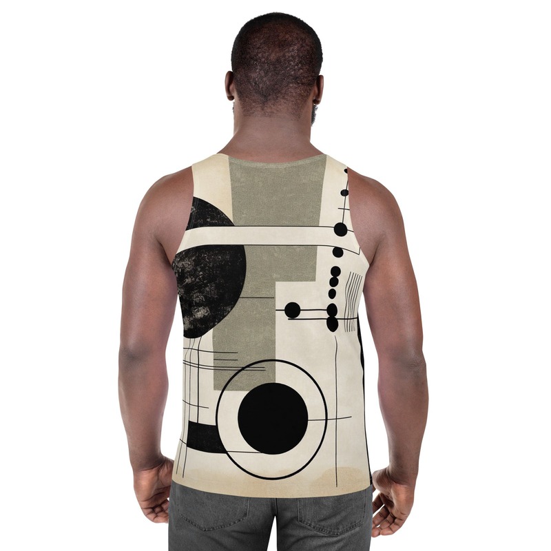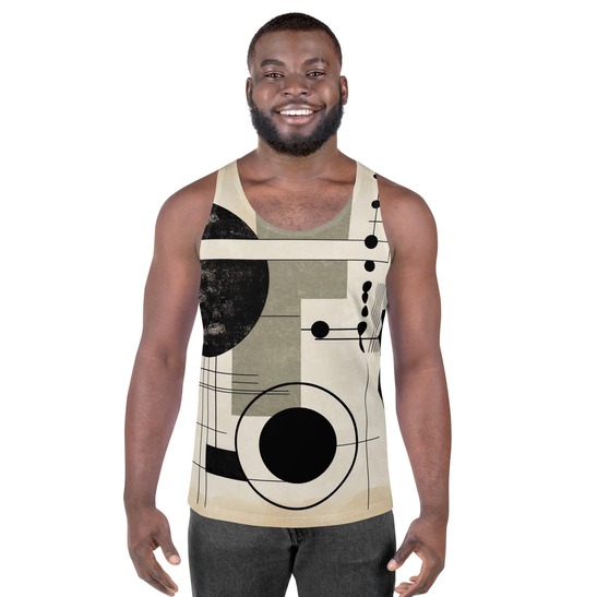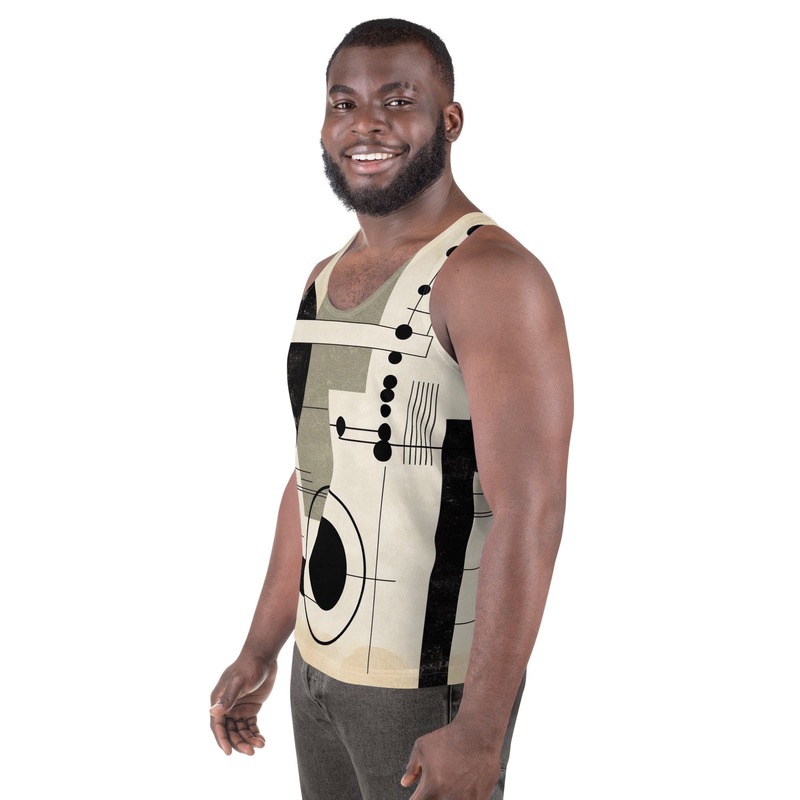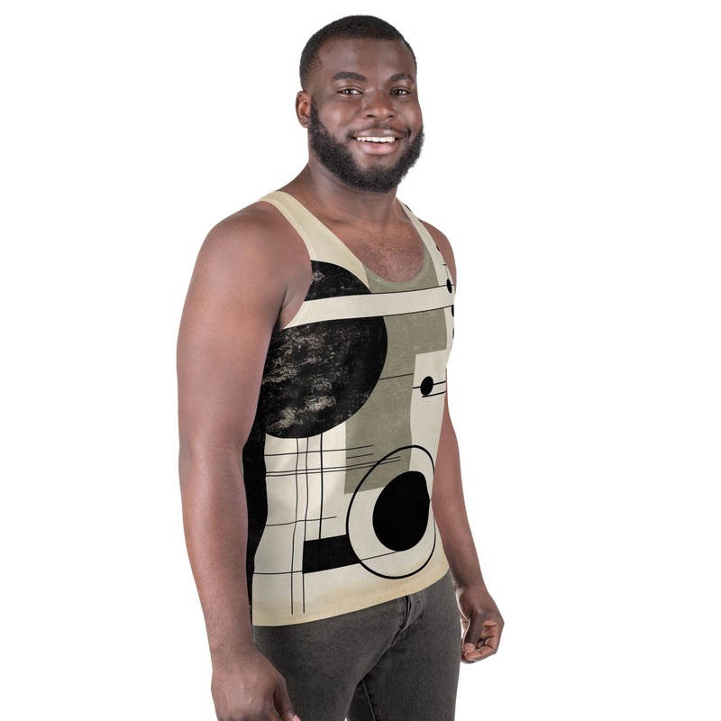 Mens Stretch Fit Tank Top, Abstract Black Beige Brown Geometric Shapes. Our men's tank top is a versatile essential that combines comfort and style seamlessly. Crafted from lightweight and breathable fabric, this tank top ensures optimal ventilation and comfort for any activity, whether you're hitting the gym or enjoying outdoor adventures. The sleeveless design and classic crew neckline offer timeless appeal, making it easy to pair with any bottoms for a laid-back look. The relaxed fit provides freedom of movement, making it ideal for active days or simply lounging at home. Elevate your wardrobe with our essential men's tank top, designed to keep you looking and feeling great in any situation.