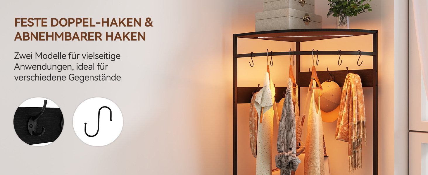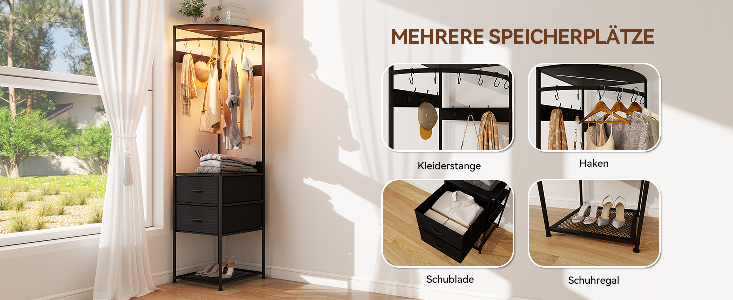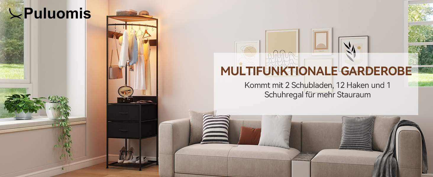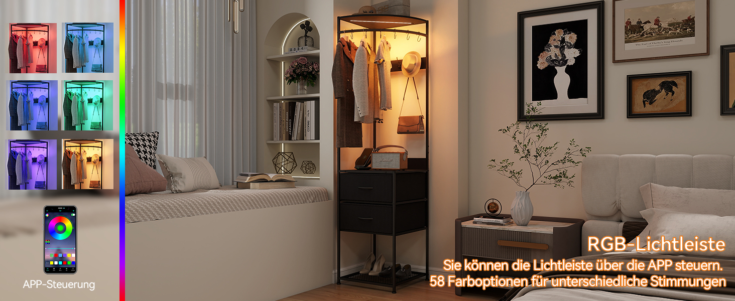 Puluomis Garderobenständer Eckgarderobe freistehender Kleiderständer mit 2 Schubladen abnehmbarem Haken APP-Funksteuerung