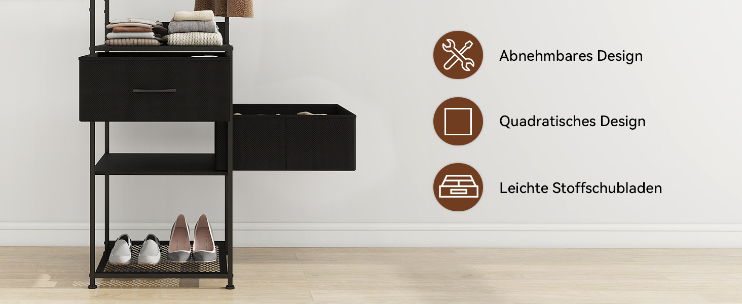 【Vielfältige Stauräume】Integrierte, gebogene Kleiderstange, feste Doppelhaken, abnehmbare Haken, Ablagetisch in der Mitte, zwei große Stoffschubladen und darunter ein Schuhregal. Kleidung, Schuhe, Taschen und Kleinteile finden jeweils ihren eigenen Stauraum – Schluss mit Unordnung.