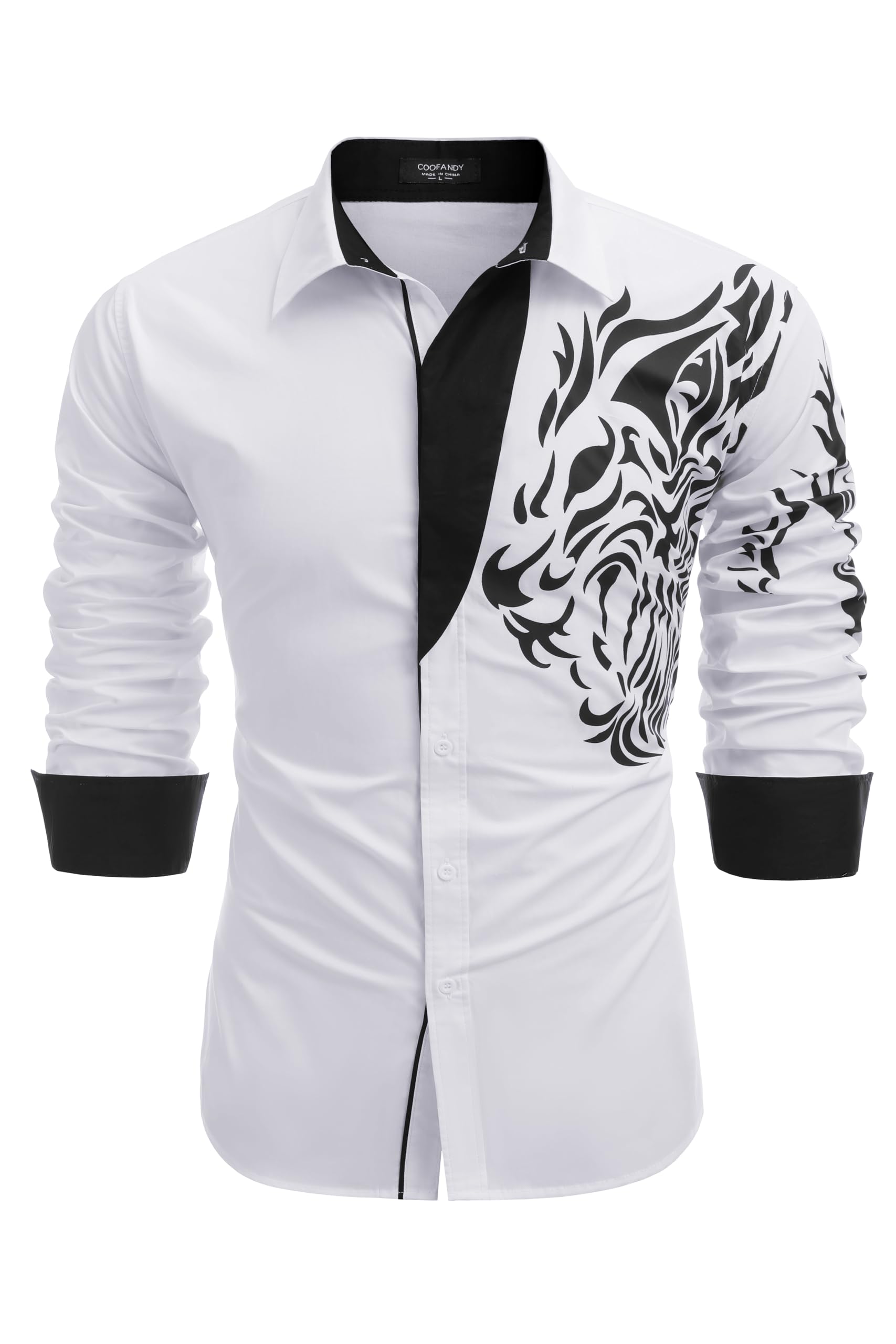 Men's Print Dress Long Sleeve Slim Fit Button Down Shirts(XL,White Animal)