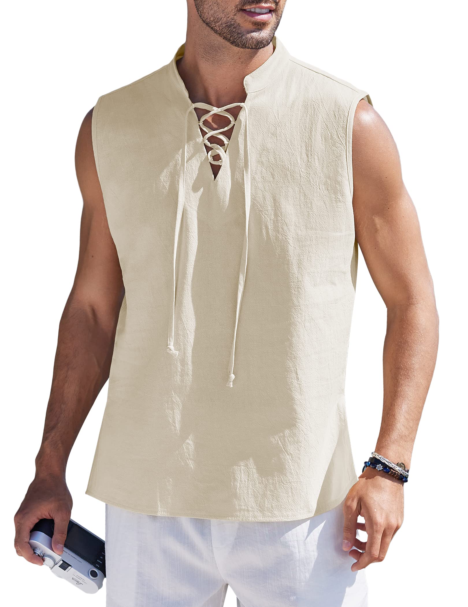 COOFANDY Men Tank Top Beach Cotton Linen Lace Up Sleeveless Shirt Bohemian Hippie Renaissance Pirate Kilt Medieval Tunic