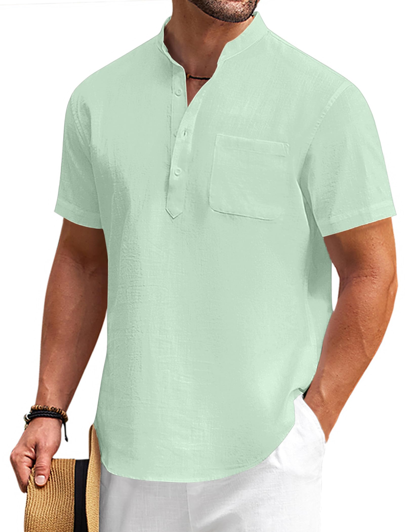COOFANDY Men's Cotton Linen Henley Shirt Short Sleeve Hippie Casual Beach T Shirts with Pocket