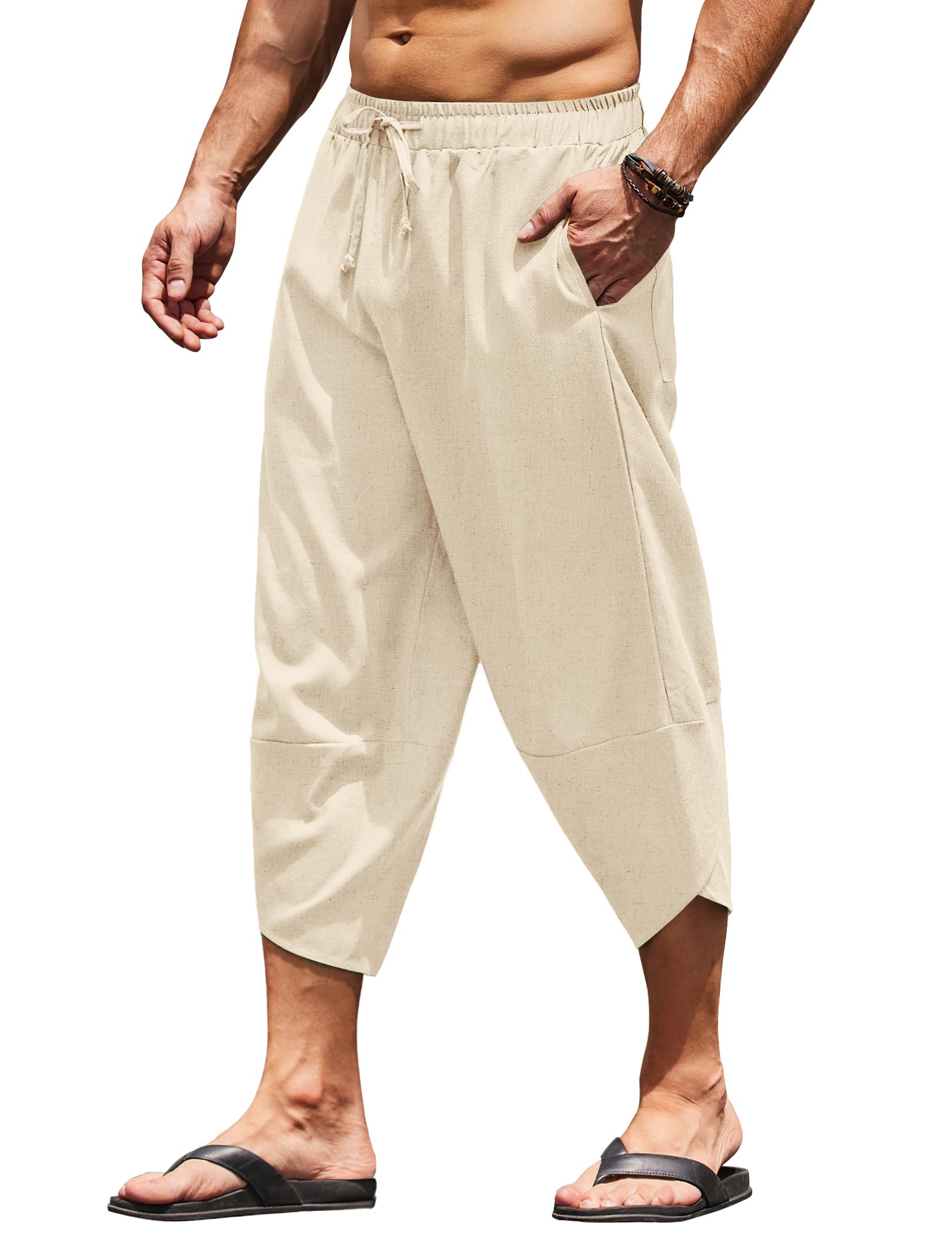 COOFANDY Men's Cotton Linen Harem Pants Lightweight Baggy Cargo Capri Shorts Drawstring Elastic Waist Loose Fit Casual Beach Yoga Trousers;Casual Summer Pants;Summer Beach Pants;Casual Linen Pants;Loose Yoga Pants; Baggy Drawstring Pants; Lightweight Beach Pants