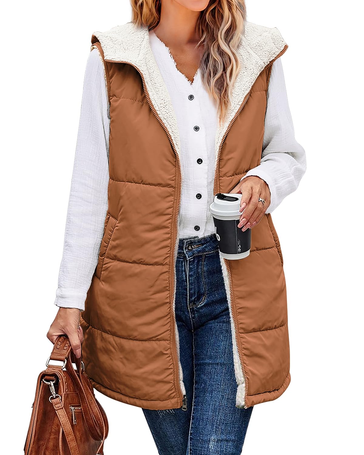 Womens Long Outerwear Vests 2042 Fall Winter Warm Sleeveless Coat Reversible Fleece Jacket Zip Up Hoodie Pockets