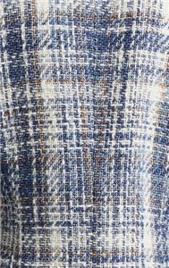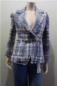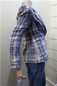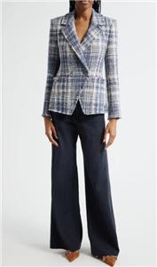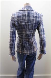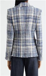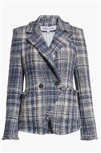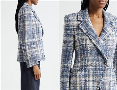 A classic tweed blazer woven from cotton-blend yarns gets a modern update with raw hems and metallic fibers.