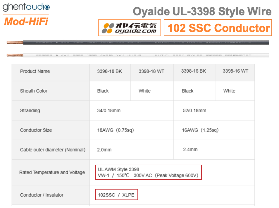 - Oyaide 3398 series wire: HiFi-grade hook-up wire, using 102 SSC conductor and XLPE insulation