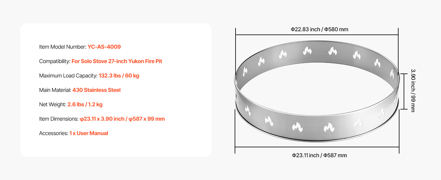 Precise Fit: Designed for Solo Stove 27-inch / 68.6 cm Bonfire. The stove bonfire base stand fits precisely with a top diameter of Φ22.83 inch / Φ579.88 mm and bottom Φ23.11 inch / Φ586.99 mm. It offers stable support, compatible with popular brands for a seamless outdoor experience