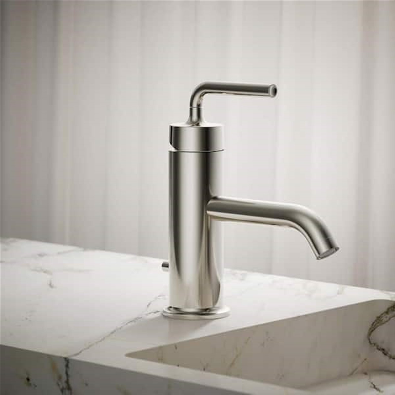It captures the inherent style of minimalist design elements. The Purist faucet delivers streamlined water control. This faucet reflects the sophisticated aesthetic of other Purist faucets, but the mono block design further enhances its sleek appearance. Single-handle design offers a simple, 1-hand operation and n be turned on and off at any temperature setting, Low-arc spout with a 2-1/2 in. H and a 5-1/2 in. reach provides easy water access and generous sink space, Solid brass construction for durability and reliability, Ceramic disk valves ensure lasting performance, Coordinates well with the Purist suite, High-temperature limit stop allows you to pre-set a comfortable maximum temperature to help reduce accidental sliding, ADA compliant, Includes drain and flexible stainless-steel supplies for an easy, single-hole installation, Flow rate range: 1.5 - 1.2