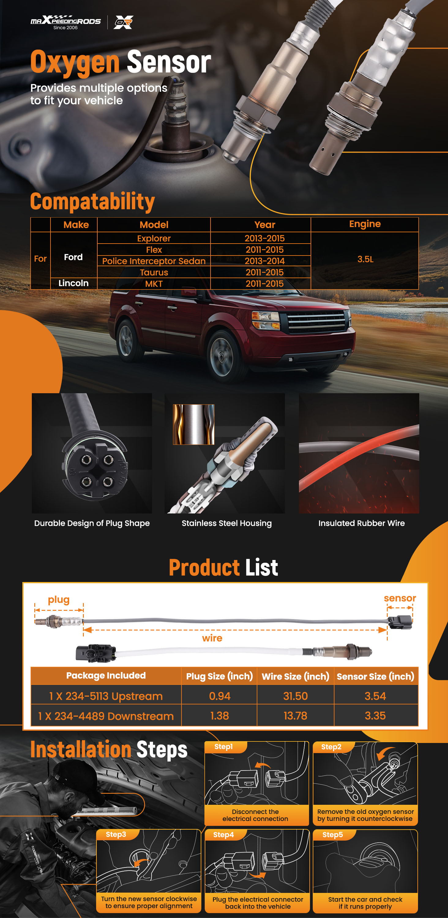 【High Quality Mateial】The oxygen sensor is equipped with a stainless steel housing. Durable and corrosion-resistant, ensuring your engine's long-lasting and stable performance.