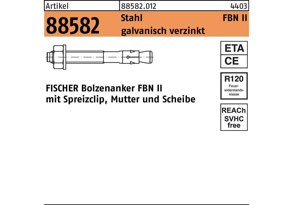 Artikel 88582 Stahl FBN II galvanisch verzinkt FISCHER Bolzenanker FBN II mit Spreizclip Mutter und Scheibe - Abmessung: FBN II 8/100 VE=S (20 Stck )Weitere technische Eigenschaften: