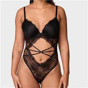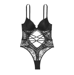 Iconic rose lace gets a little risqué with dramatic cutouts and sexy straps on this lightly padded one-piece. Lightly lined. Underwire. Adjustable straps. Low-cut neckline. Cutouts with strappy accents. Back hook-and-eye closures. Snap gusset closures. No back coverage. Cotton gusset panel. Made of nylon/spandex/polyester.