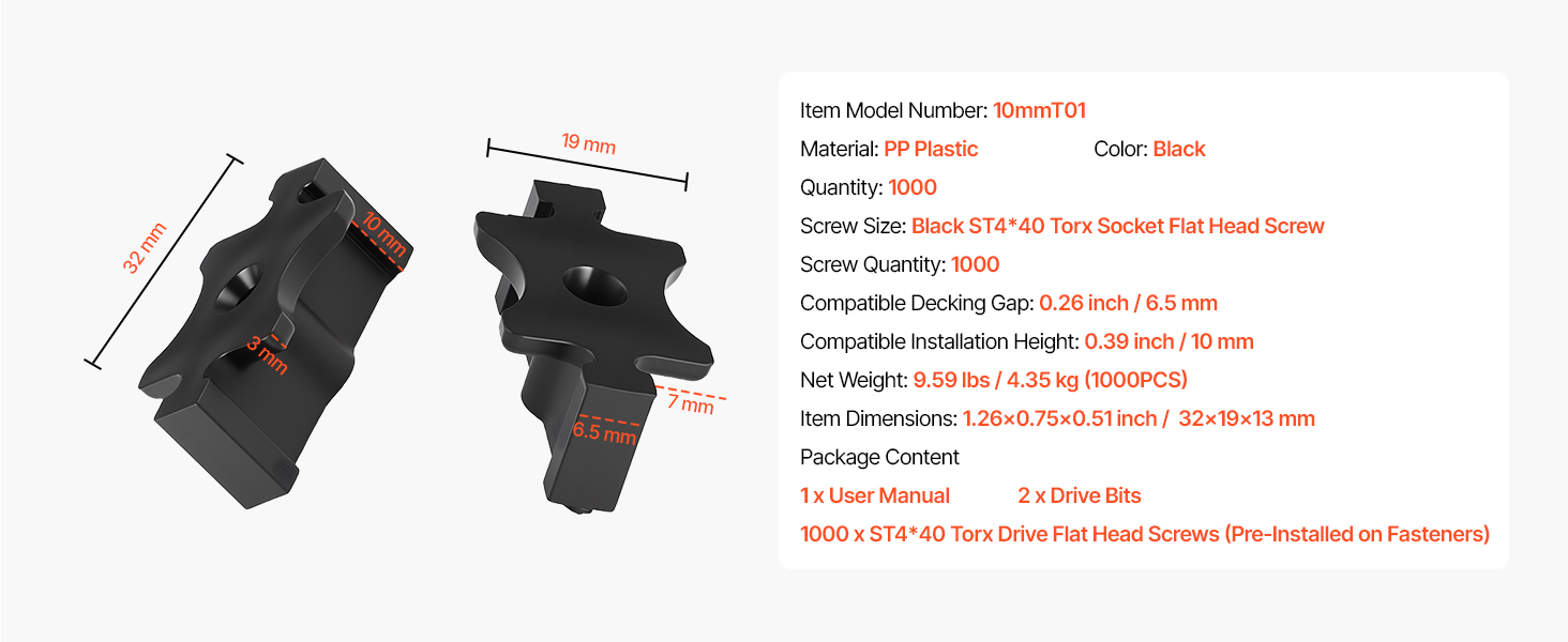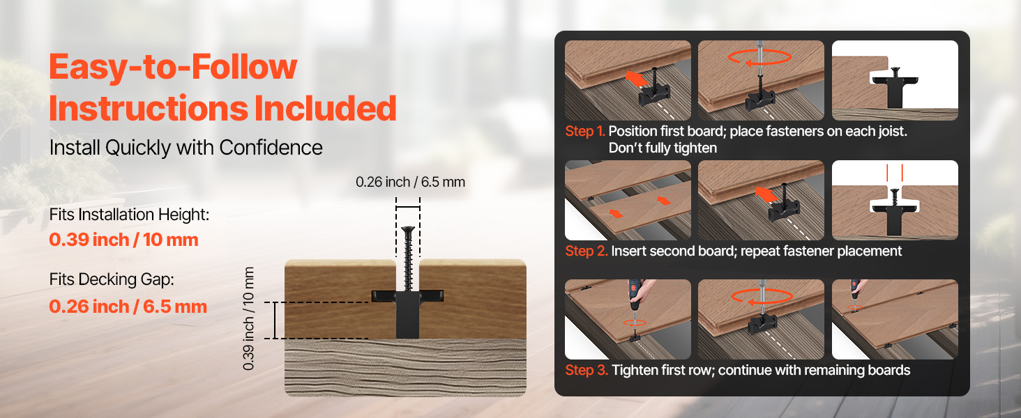 Comprehensive Installation Set: This package contains 1000 hidden fasteners, 2 drive bits, and screws, providing all the essentials to cover an area of approximately 550 sq.ft / 55㎡. Designed to fit board gaps of 0.26 inch / 6.5 mm and board heights of 0.4 inch / 10 mm. Includes all necessary components for immediate setup.