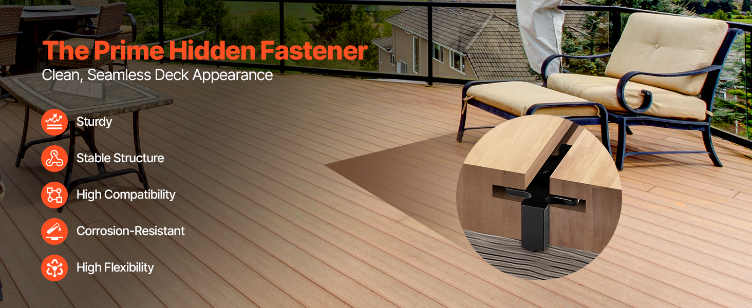 Perfect for enhancing outdoor spaces like backyard decks, balconies, patios, and poolside areas, these concealed deck fasteners offer a sleek and inviting look with ease of installation.