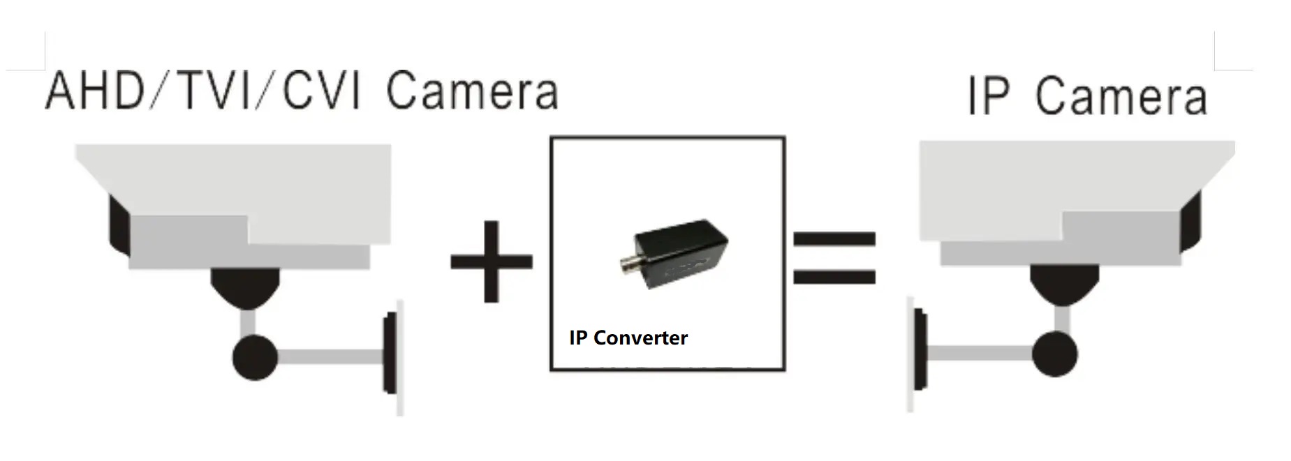 IP Converter is a device that converts the 2MP AHD/TVI/CVI camera into an IP Camera without changing the original wiring facilities. BNC interface input, RJ45 interface output. The converter uses the standard ON-VIF protocol and can access NVR.