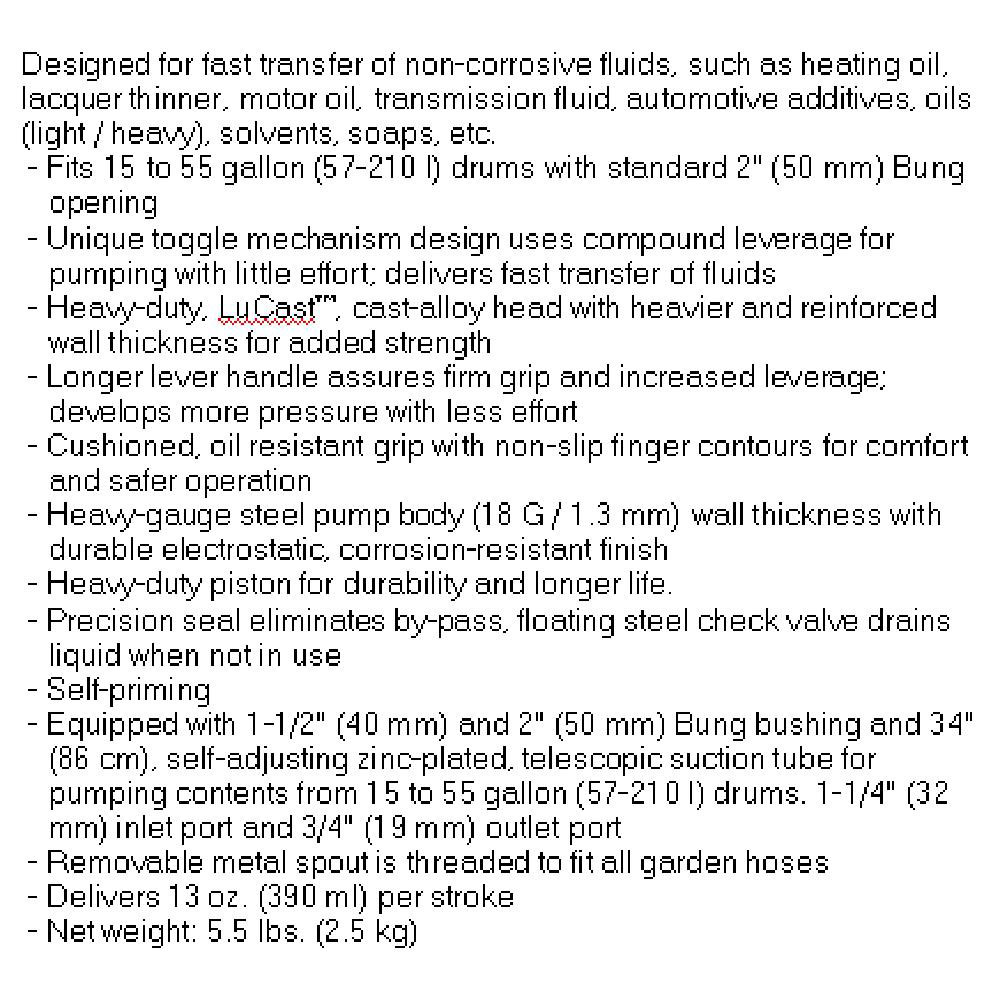 DESCRIPTION This heavy-duty lever action barrel pump is designed for fast, controlled transfer of oil-based fluids from 15 to 55 gallon drums. The pump features a premium powder-coated steel body with a ribbed section, an aluminum die-cast pump head, and brass piston rings for extended service life. Ideal for farm, shop, fleet, and industrial use wherever bulk oil needs to be dispensed from standard drums. Fits standard 15, 30, and 55 gallon steel and plastic drums with 1-1/2" or 2" bung openings. Suitable for use with diesel, heating oil, motor oil, light and heavy oils, transmission fluid, and other oil-based non-corrosive media. CAUTION: Do NOT use with water-based fluids, solvents, acids, antifreeze, or gasoline. These media can damage the pump or create a hazardous condition. Groz 44100, LBP/04, A-B1PL44100-AI New aftermarket replacement part - not remanufactured, not used.One New Heavy-Duty Lever Action Barrel Pump - Groz 44100 (LBP/04)