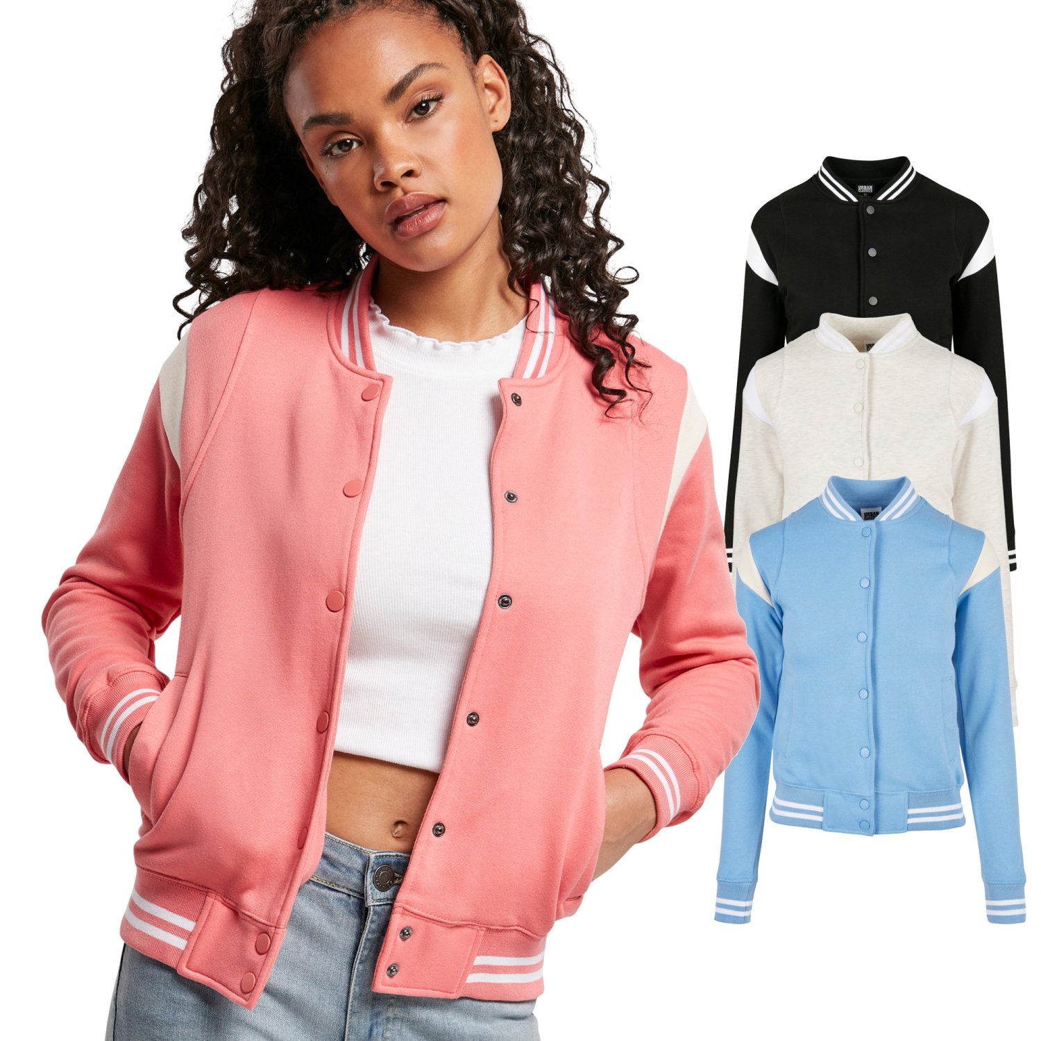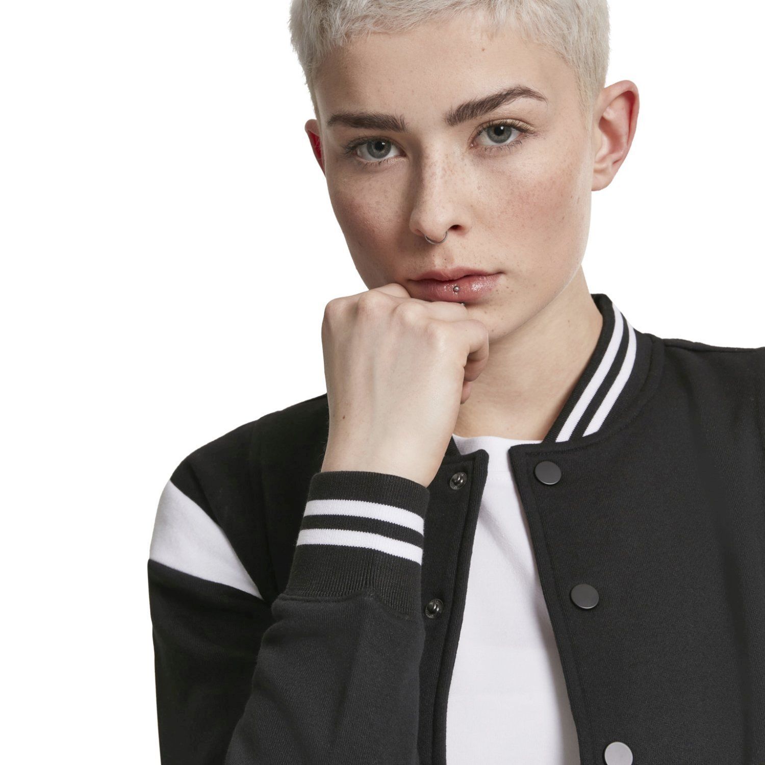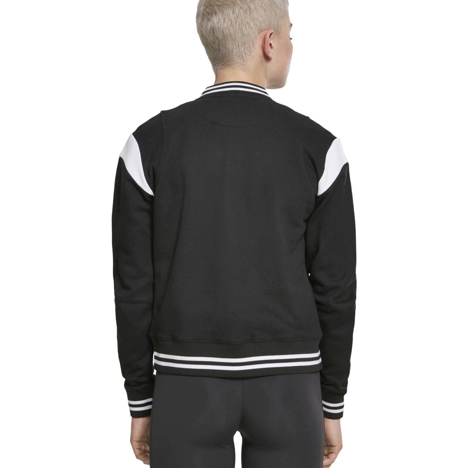 Light jacket in college look.Contrast sleeves, press studs, side pockets and striped cuffs.Material: 63% cotton, 37% polyester. Brushed fleece, 300 GSM.